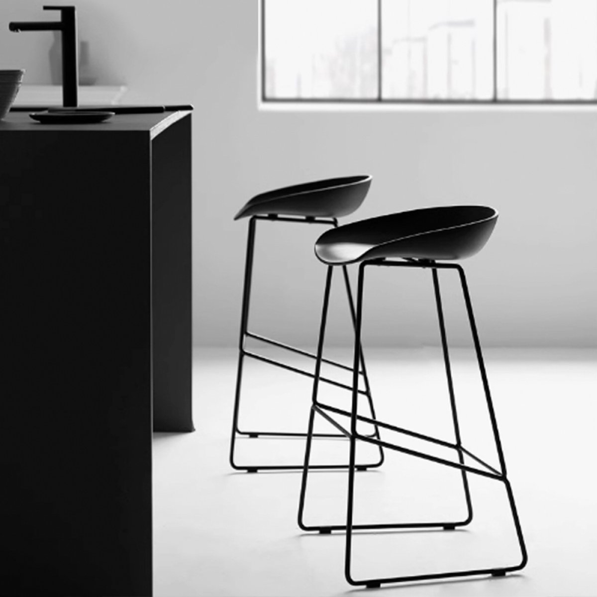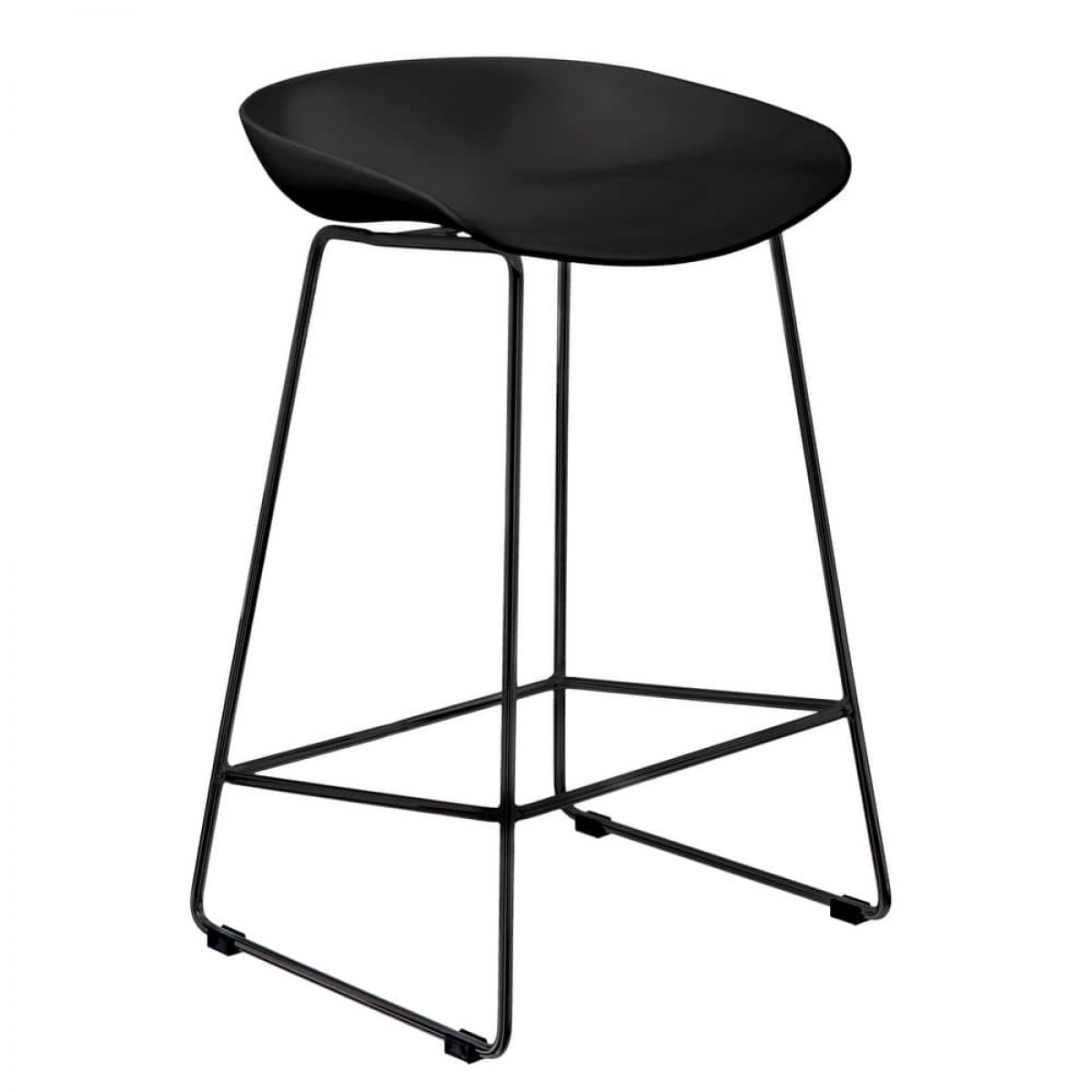 Утончённые металлические опоры, сиденье из пластика с невысокой спинкой - это минималистический современный дизайн полубарного стула NEO черный с черными ножками.
