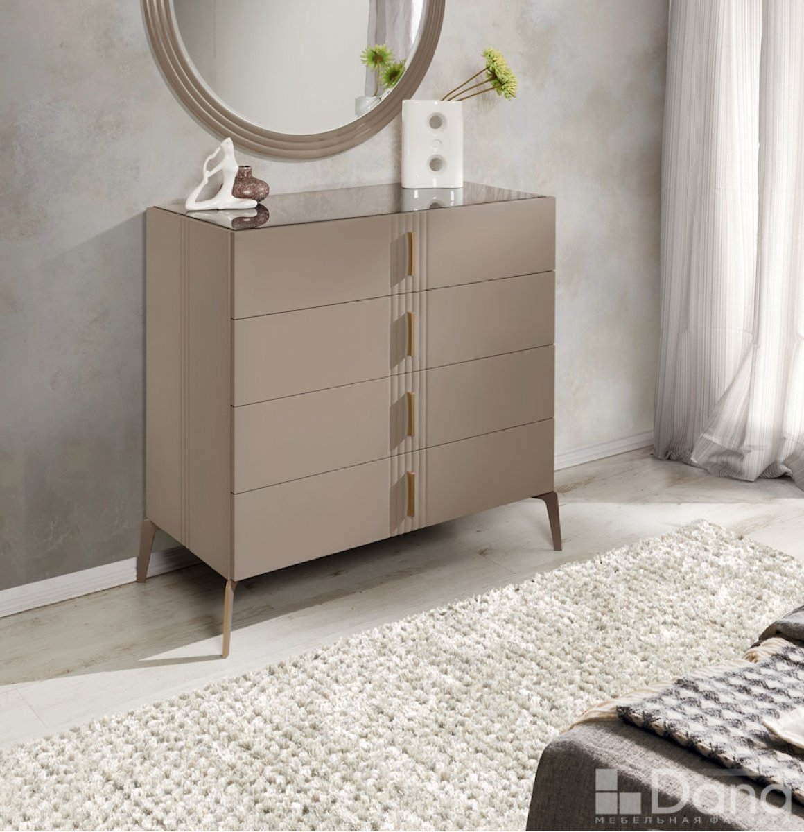 Комод серии Dimare выполнен в современном стиле модерн. Содержит четыре выдвижными ящиками. Внутренние габариты ящиков (ШхВхГ): 928х110х368 мм. Может использоваться как для спальных комнат, так и для гостиных или прихожих. Коллекция Dimare - одна из лучших разработок наших дизайнеров, построенная на балансе трендового серо-бежевого цвета и матового золота. Прекрасно смотрится при различной степени освещенности помещения, меняя восприятие оттенков и рельефных элементов. Мебель коллекции Dimare имеет практическое преимущество в виде усиленной конструкции – задняя стенка выполнена из плиты 16 мм, а дно выдвижного ящика имеет толщину 8 мм. Накладная столешница из стекла, тонированного в цвет антрацит, является дополнительной (платной) опцией. Она защищает верхнее покрытие от износа и придает мебели дополнительный шарм. Фасадная часть и боковины покрыты ультра современной матовой пленкой ПВХ soft touch. Опоры произведены из стали и имеют многослойное лакокрасочное покрытие с окраской торцов в цвет матового золота. Направляющие ящиков – скрытого монтажа, снабжены доводчиками. Корпус внутри произведен из ЛДСП высшего качества, фасады и боковины выполнены из МДФ. Крепежные элементы и конструкция позволяют неоднократно собирать и разбирать мебель.