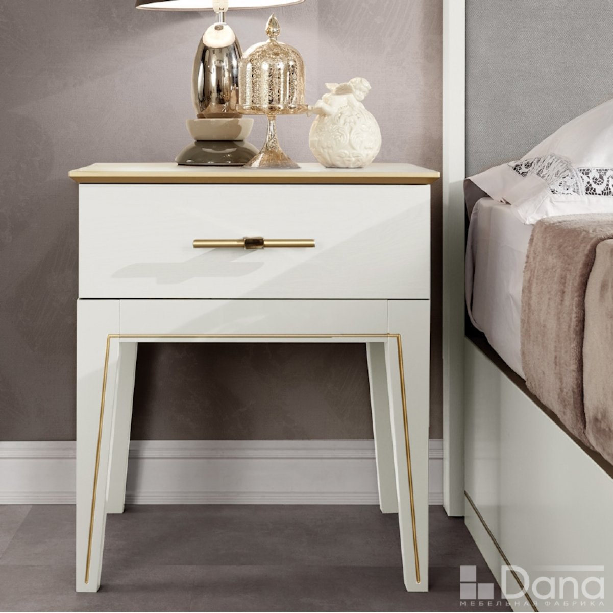 Тумбочка серии Palmari выполнена в современном стиле модерн. Содержит выдвижной ящик. Может использоваться как для спальных комнат, в качестве прикроватной, так и самостоятельно. Коллекция Palmari - замечательная разработка наших дизайнеров, построенная на балансе трендового белого цвета и матового золота. Прекрасно смотрится при различной степени освещенности помещения, меняя восприятие оттенков и акцентных элементов. Мебель коллекции Palmari имеет практическое преимущество в виде усиленной конструкции – задняя стенка выполнена из плиты 16 мм, а дно выдвижного ящика имеет толщину 8 мм. Столешница произведена из МДФ, покрытого декоративным пластиком HPL с матовой поверхностью. Этот современный материал, толщиной в 0,5 мм в разы более прочный и износостойкий, чем обычное лаковое или ламинированное покрытие. Фасадная часть и боковины покрыты пленкой PVC с неглубокой текстурой шпона дуба, которая органично и ненавязчиво смотрится на мебели. Основание (опоры и царговый пояс) выполнено из натурального дерева – массива бука, имеет сложную фрезеровку и двуцветное лакокрасочное покрытие. Направляющие ящиков – скрытого монтажа, снабжены доводчиками. Лицевая фурнитура – премиум класса. Корпус произведен из ЛДСП высшего качества, фасады содержат профиль МДФ. Крепежные элементы и конструкция позволяют неоднократно собирать и разбирать мебель.