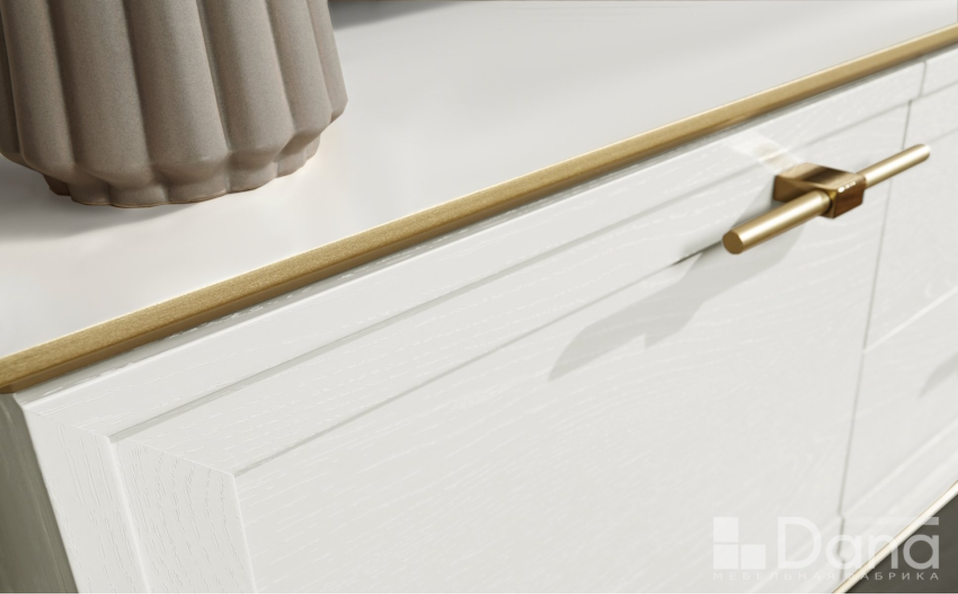 Комод для ТВ серии Palmari выполнен в современном стиле модерн. Содержит две секции с дверьми, которые снабжены полками, и центральную часть с тремя выдвижными ящиками. Коллекция Palmari - замечательная разработка наших дизайнеров, построенная на балансе трендового белого цвета и матового золота. Прекрасно смотрится при различной степени освещенности помещения, меняя восприятие оттенков и акцентных элементов. Даже внутри эта мебель не выглядит скучной: полки имеют металлизированную кромку в цвет брашированного золота, а секции могут дополнительно комплектоваться автоматической подсветкой, которая включается в момент открытия дверцы и выключается при ее закрытии. Мебель коллекции Palmari имеет практическое преимущество в виде усиленной конструкции – задняя стенка выполнена из плиты 16 мм, а дно ящика имеет толщину 8 мм. Столешница произведена из МДФ, покрытого декоративным пластиком HPL с матовой поверхностью. Этот современный материал, толщиной в 0,5 мм в разы более прочный и износостойкий, чем обычное лаковое или ламинированное покрытие. Фасадная часть и боковины покрыты пленкой PVC с неглубокой текстурой шпона дуба, которая органично и ненавязчиво смотрится на мебели. Опоры произведены из стали и имеют многослойное лакокрасочное покрытие в цвет матового золота, регулируются по высоте. Направляющие ящиков – скрытого монтажа, как и петли дверей, они снабжены доводчиками. Лицевая фурнитура – премиум класса. Корпус произведен из ЛДСП высшего качества, фасады содержат профиль МДФ. Крепежные элементы и конструкция позволяют неоднократно собирать и разбирать мебель.