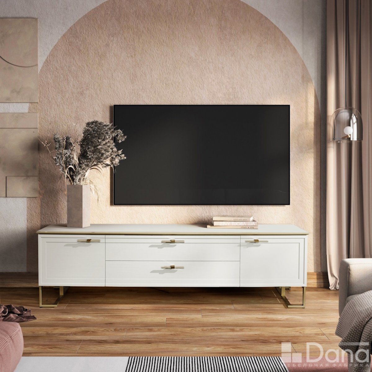 Комод для ТВ серии Palmari выполнен в современном стиле модерн. Содержит две секции с дверьми, которые снабжены полками, и центральную часть с тремя выдвижными ящиками. Коллекция Palmari - замечательная разработка наших дизайнеров, построенная на балансе трендового белого цвета и матового золота. Прекрасно смотрится при различной степени освещенности помещения, меняя восприятие оттенков и акцентных элементов. Даже внутри эта мебель не выглядит скучной: полки имеют металлизированную кромку в цвет брашированного золота, а секции могут дополнительно комплектоваться автоматической подсветкой, которая включается в момент открытия дверцы и выключается при ее закрытии. Мебель коллекции Palmari имеет практическое преимущество в виде усиленной конструкции – задняя стенка выполнена из плиты 16 мм, а дно ящика имеет толщину 8 мм. Столешница произведена из МДФ, покрытого декоративным пластиком HPL с матовой поверхностью. Этот современный материал, толщиной в 0,5 мм в разы более прочный и износостойкий, чем обычное лаковое или ламинированное покрытие. Фасадная часть и боковины покрыты пленкой PVC с неглубокой текстурой шпона дуба, которая органично и ненавязчиво смотрится на мебели. Опоры произведены из стали и имеют многослойное лакокрасочное покрытие в цвет матового золота, регулируются по высоте. Направляющие ящиков – скрытого монтажа, как и петли дверей, они снабжены доводчиками. Лицевая фурнитура – премиум класса. Корпус произведен из ЛДСП высшего качества, фасады содержат профиль МДФ. Крепежные элементы и конструкция позволяют неоднократно собирать и разбирать мебель. Для обеспечения устойчивости в комплект входит дополнительная опора.