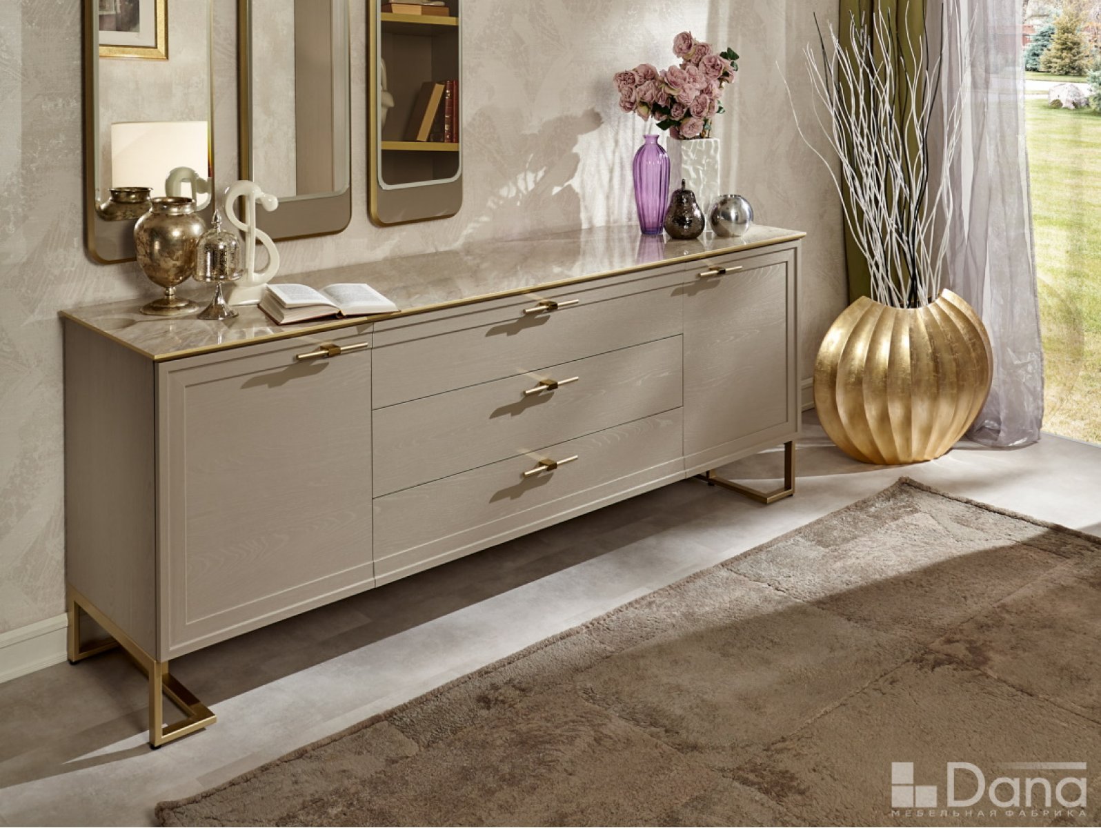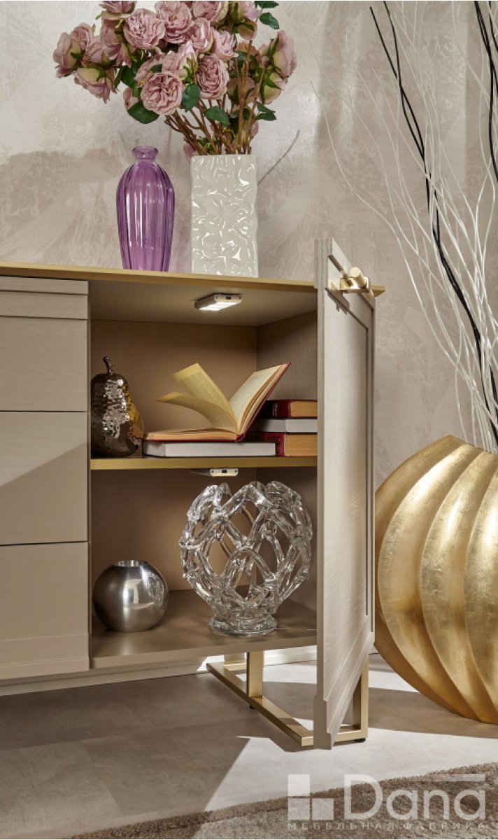 Комод серии Palmari выполнен в современном стиле модерн. Содержит две секции с дверьми, которые снабжены полками, и центральную часть с тремя выдвижными ящиками. Коллекция Palmari - замечательная разработка наших дизайнеров, построенная на балансе трендовых цветов «Серый базальт» и матового золота. Прекрасно смотрится при различной степени освещенности помещения, меняя восприятие оттенков и акцентных элементов. Даже внутри эта мебель не выглядит скучной: полки имеют металлизированную кромку в цвет брашированного золота, а секции могут дополнительно комплектоваться автоматической подсветкой, которая включается в момент открытия дверцы и выключается при ее закрытии. Мебель коллекции Palmari имеет практическое преимущество в виде усиленной конструкции – задняя стенка выполнена из плиты 16 мм, а дно ящика имеет толщину 8 мм. Столешница произведена из МДФ, покрытого декоративным пластиком HPL с текстурой натурального камня. Этот современный материал, толщиной в 0,5 мм, имеет высоко глянцевый блеск и в разы более прочный и износостойкий, чем обычное лаковое покрытие. Фасадная часть и боковины покрыты пленкой PVC с неглубокой текстурой шпона дуба, которая органично и ненавязчиво смотрится на мебели. Опоры произведены из стали и имеют многослойное лакокрасочное покрытие в цвет матового золота, регулируются по высоте. Направляющие ящиков – скрытого монтажа, как и петли дверей, они снабжены доводчиками. Лицевая фурнитура – премиум класса. Корпус произведен из ЛДСП высшего качества, фасады содержат профиль МДФ. Крепежные элементы и конструкция позволяют неоднократно собирать и разбирать мебель.