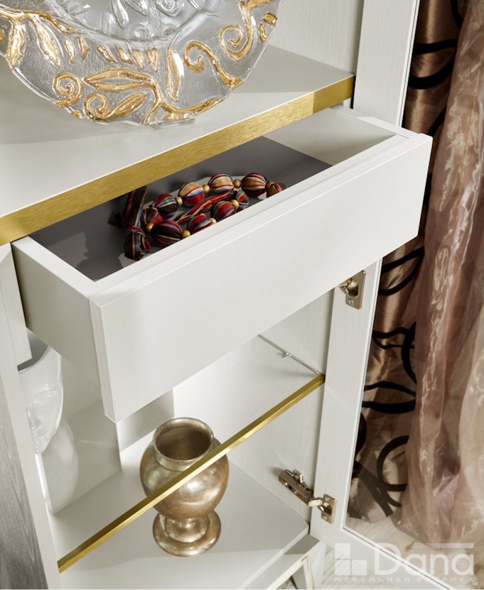 Библиотека (книжный шкаф) серии Palmari выполнена в современном стиле модерн. Содержит 4 полки толщиной 26 мм. Коллекция Palmari - замечательная разработка наших дизайнеров, построенная на балансе трендового белого цвета и матового золота. Прекрасно смотрится при различной степени освещенности помещения, меняя восприятие оттенков и акцентных элементов. Даже внутри эта мебель не выглядит скучной: полки имеют металлизированную кромку в цвет брашированного золота, а секции могут дополнительно комплектоваться внутренним выдвижным ящиком со скрытыми направляющими. Мебель коллекции Palmari имеет практическое преимущество в виде усиленной конструкции – задняя стенка выполнена из плиты 16 мм, а дно ящика имеет толщину 8 мм. Фасадная часть и боковины покрыты пленкой PVC с неглубокой текстурой шпона дуба, которая органично и ненавязчиво смотрится на мебели. Основание (опоры и царговый пояс) выполнено из натурального дерева – массива бука, имеет сложную фрезеровку и двуцветное лакокрасочное покрытие. Направляющие ящиков, как и петли дверей, снабжены доводчиками. Лицевая фурнитура – премиум класса. Корпус произведен из ЛДСП высшего качества, фасады содержат профиль МДФ и закаленное стекло. Крепежные элементы и конструкция позволяют неоднократно собирать и разбирать мебель.