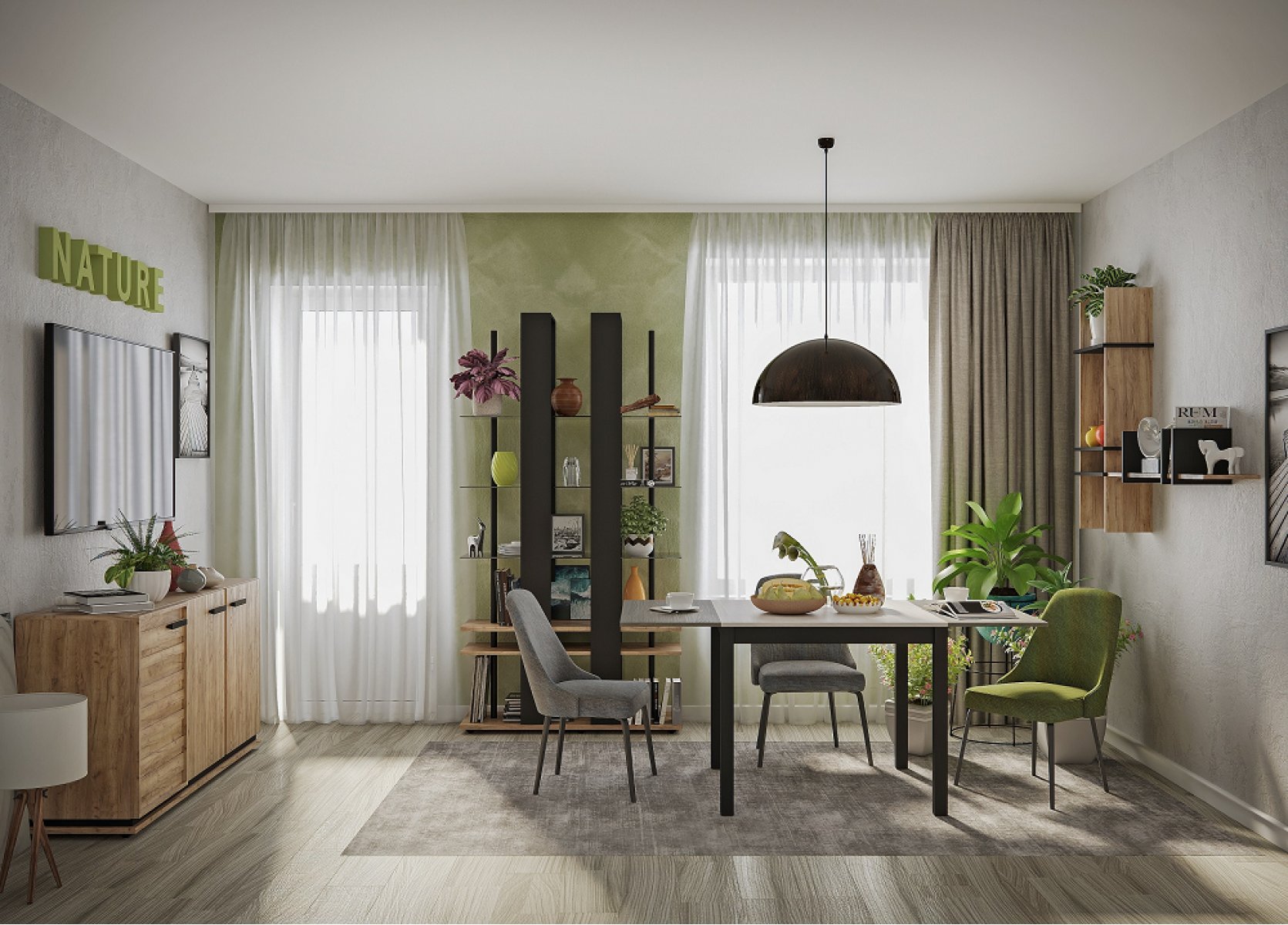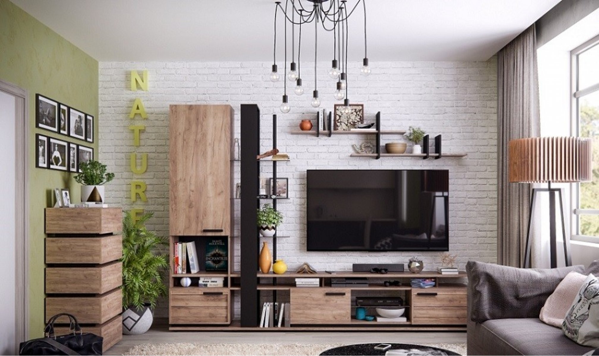 Минимализм в гостиной: NATURE 5 Тумба МЦН и композиция из Стеллажей и Навесных полок
