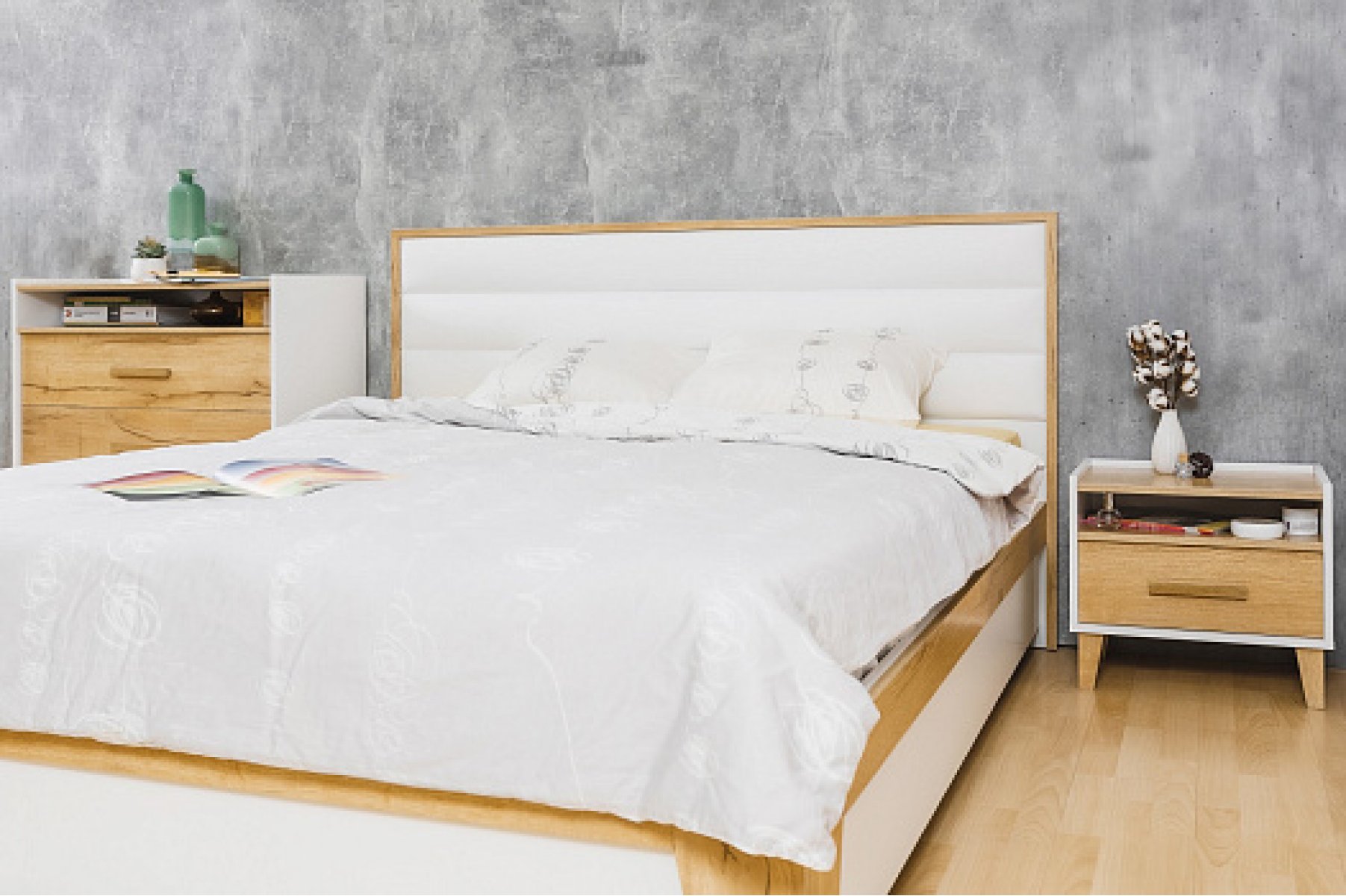 Ключевым элементом в Вашей современной спальне станет двуспальная кровать Айрис. Текстурные опоры и массивная рама на изголовье поддерживают эко-направленность всей коллекции, выполненной в скандинавском стиле. Мягкая спинка со стяжкой обтянута белой экокожей, которая не боится деформации и не требует специального ухода. Кровать комплектуется надежным стационарным основанием с деревянным каркасом и гибкими ламелями из фанеры.Оно экологично и выдерживает нагрузку в 440 кг с учетом матраса. Матрас приобретается отдельно.