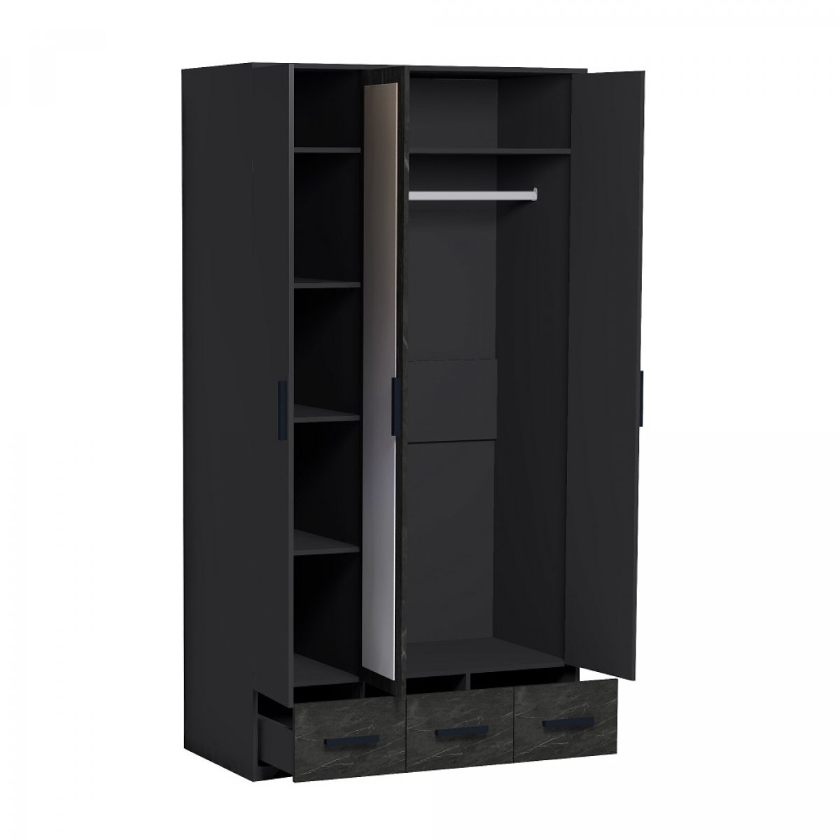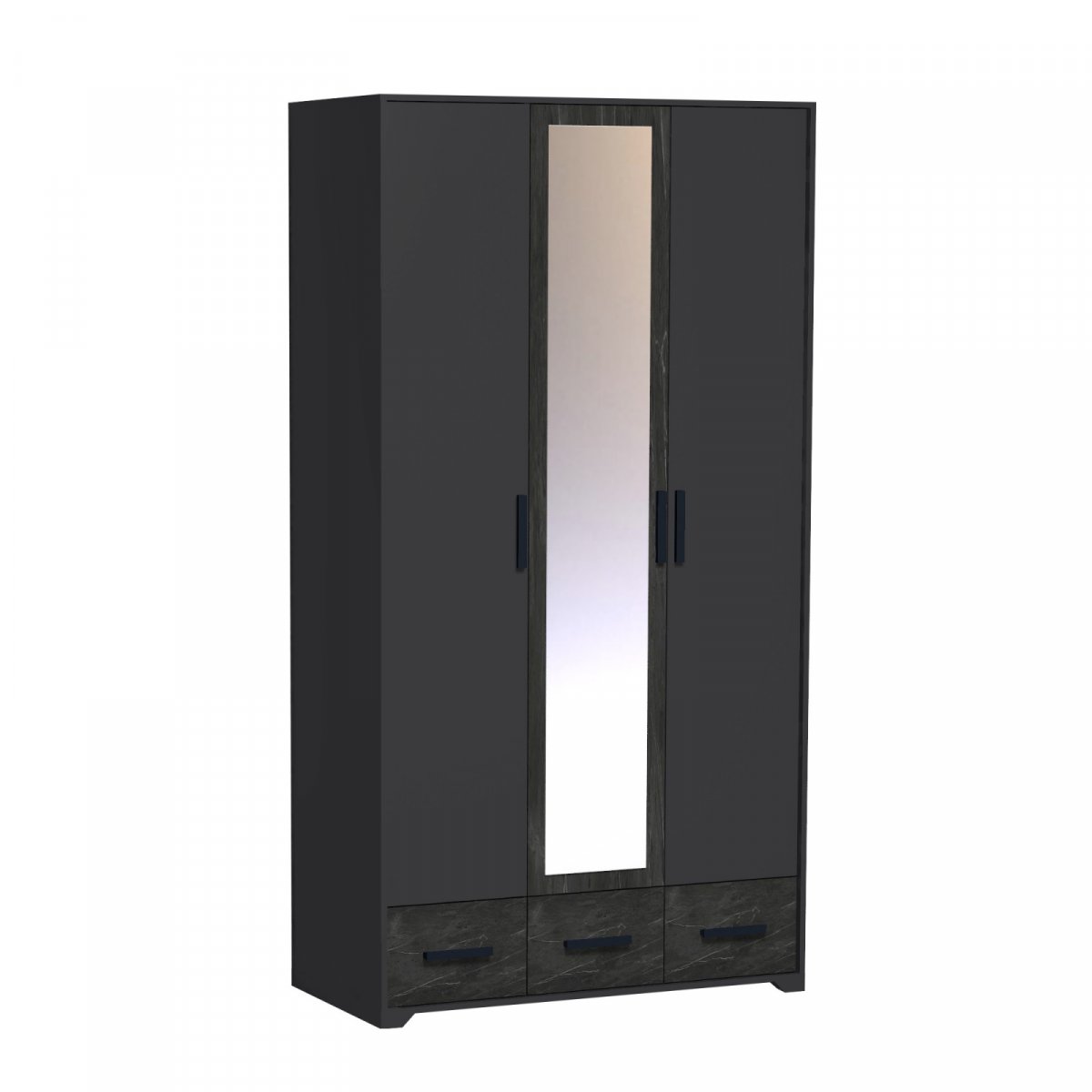 Трехдверный шкаф из коллекции Айрис - лучшее решение для организации хранения в малогабаритной спальне. Сделав выбор в пользу данной модели, Вам не придется докупать дополнительно комод или тумбу: разноплановое наполнение позволит разместить все вещи, от деликатной одежды на плечиках до белья и аксессуаров. Модель оснащена вместительной продольной штангой, комплектом полок и 3-мя ящиками полного выдвижения для максимальной вместимости. Зеркало на центральном фасаде визуально облегчает конструкцию шкафа и добавляет ему функциональности. Для максимальной безопасности крепится к стене за подвесы.