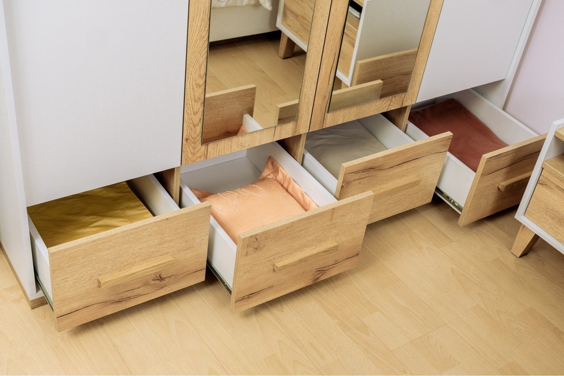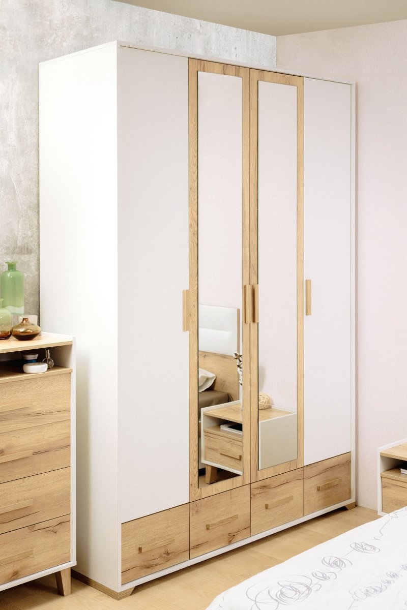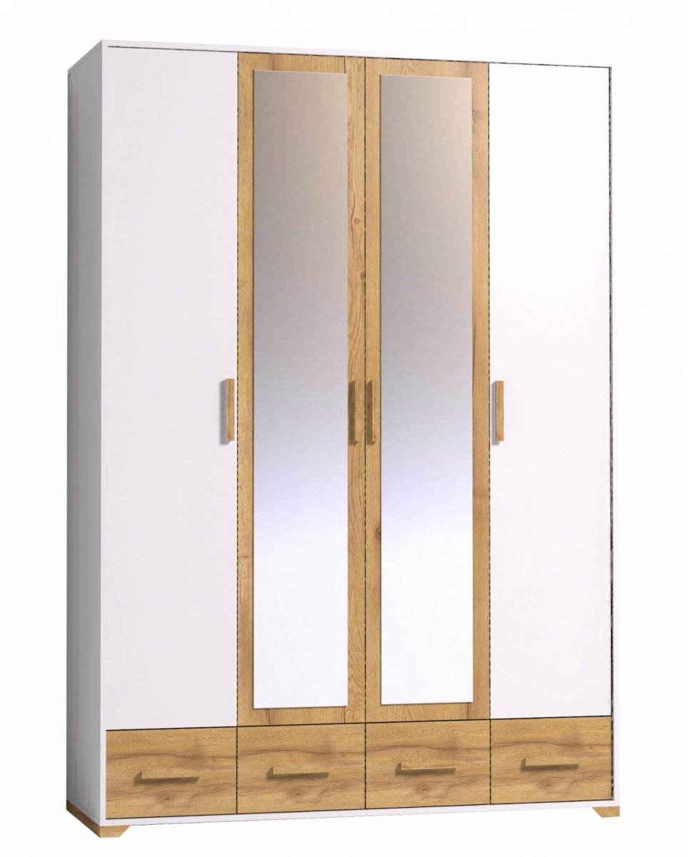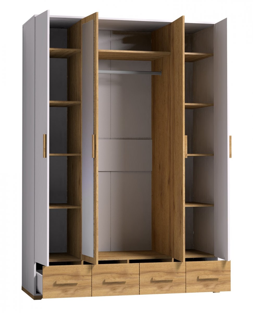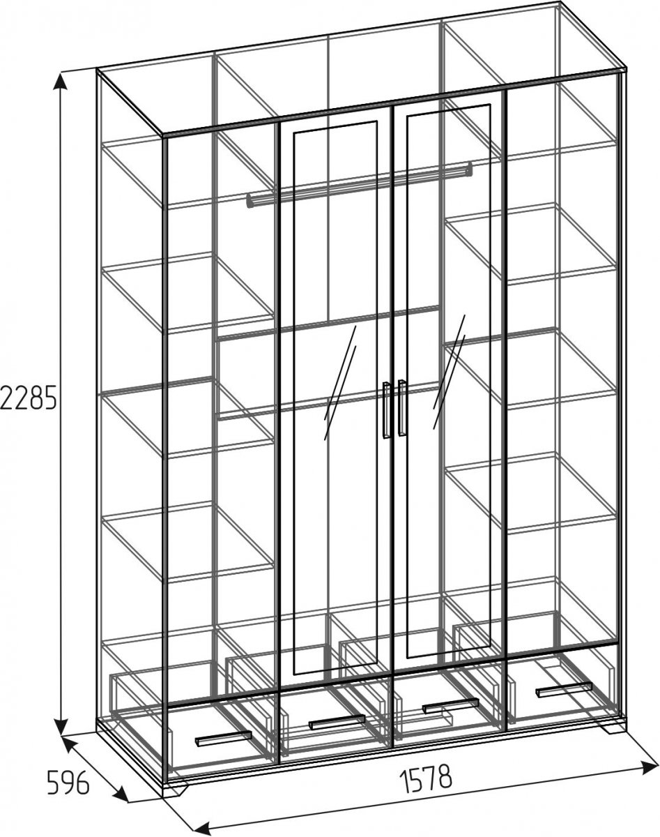 Хотите грамотно обустроить хранение в спальне? Вместительный четырехдверный шкаф из коллекции Айрис решит эту задачу. Продуманное до мелочей наполнение шкафа позволит Вамзонировать хранение одежды всех членов Вашей семьи. По бокам модуля имеется комплект полок для вещей в сложенном виде, центральная секция оснащена продольной штангой для деликатной одежды на плечиках и длинной полкой для коробок. Максимальная нагрузка на штангу - 40 кг. В четырех выкатных ящиках на шариковых направляющих плавного и бесшумного выдвижения хватит места для постельных принадлежностей, текстиля, белья и аксессуаров. Приятное сочетание древесного оттенка с белым и комбинированный зеркалом фасад визуально облегчит и расширит пространство Вашей спальни. Модуль крепится на стену за подвесы.