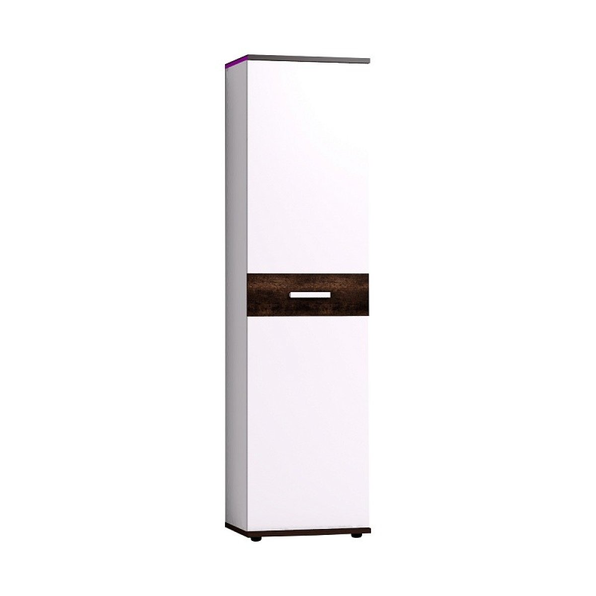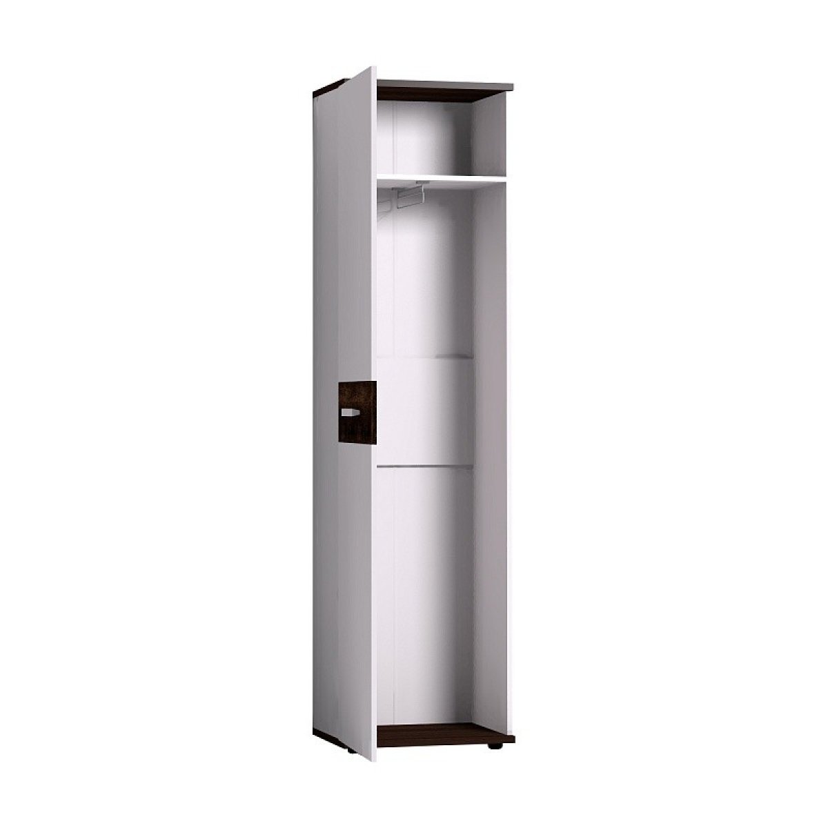 Распашной шкаф для одежды и белья комплектуется выдвижной штангой для одежды. При желании можно докупить и установить модульНорвуд 72 Полки(в комплекте 3 полки) в заранее просверленные варианты присадки. Верхняя и нижняя детали шкафа толщиной 22 мм в декоре Орех Шоколадный и брашированная вставка - яркие акценты простого белого модуля.