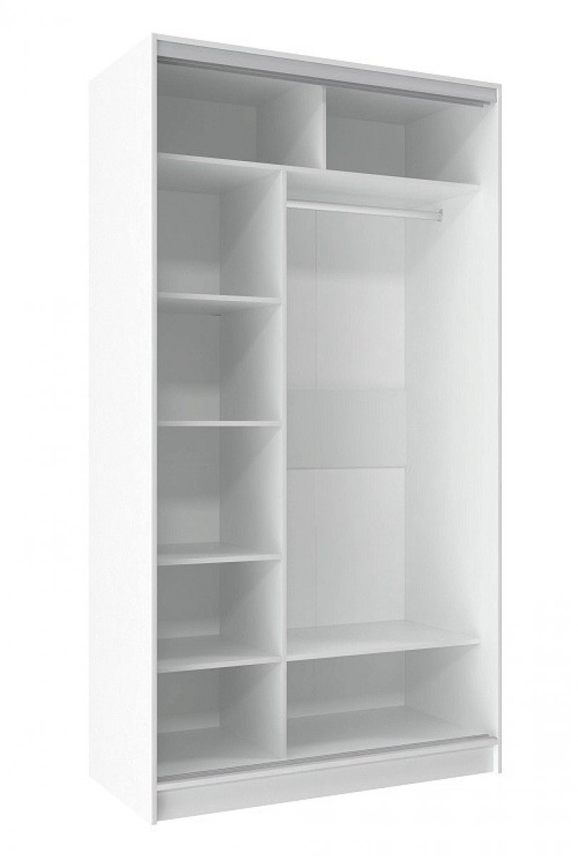 Вшкафу-купе шириной 120 смнайдется место для гардероба всей семьи. Разместите в нем бельё, верхнюю одежду и аксессуары. Продуманное внутреннее наполнение шкафа состоит из стеллажа для белья, четырех больших ниш внизу и вверху, а также стационарной штанги. Две двери настальном профиле "Найди"в цвет основного декора шкафа плавно перемещаются. Если нужно взять вещи из шкафа в темное время суток и при этом не разбудить супруга,установитеКарниз 202 Домашнийс подсветкой (опция).