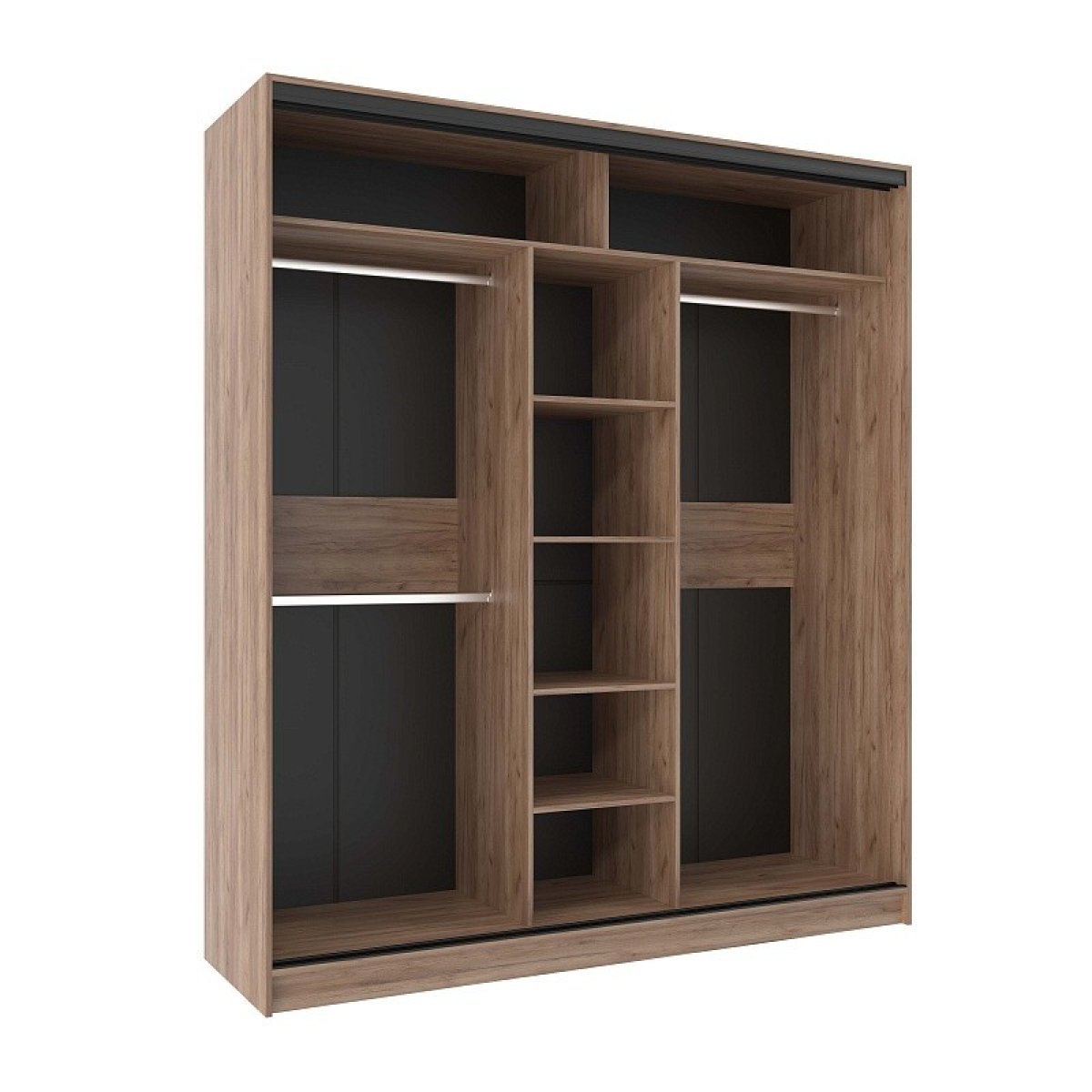 В шкафу-купе шириной 2 м найдется место для гардероба всей семьи. Разместите в нем бельё, верхнюю одежду, головные уборы и саквояж. Продуманное внутреннее наполнение, состоящее из трёх стационарных штанг и полок для белья, позволяет зонировать хранение одежды каждого члена семьи. Благодаря разделению фасада на три двери, доставать вещи очень легко. Если нужно взять вещи из шкафа в темное время суток и при этом не разбудить супруга,установитеКарниз 101 Домашнийс подсветкой.