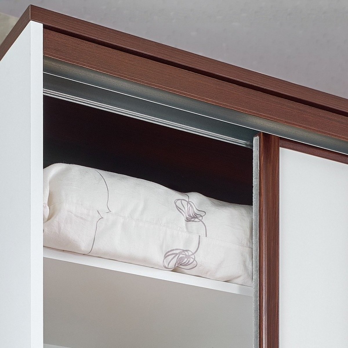 Небольшой шкаф-купе в прихожую с продуманным внутренним наполнением позволяет рационально использовать площадь небольшого коридора в квартире. В комплектацию шкафа входят: выдвижная штанга и регулируемые по высоте полки для одежды. Два фасада - зеркальный и глухой - перемещаются на стальной системе Найди, которая обеспечивает легкость открывания, плавность и бесшумность хода. Зеркальный фасад проклеен с обратной стороны защитной пленкой. Шкаф-купе создан на контрасте: белый корпус, белый глухой фасад и горизонтальные детали в декоре Орех Шоколадный, трек и профили цвета венге, темная брашированная вставка из дерева. Регулируемые опоры компенсируют незначительные неровности пола.