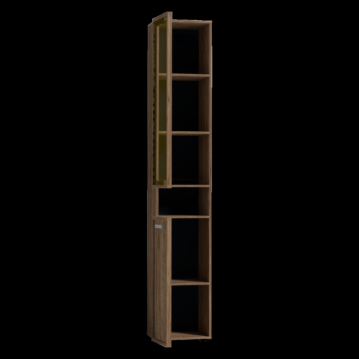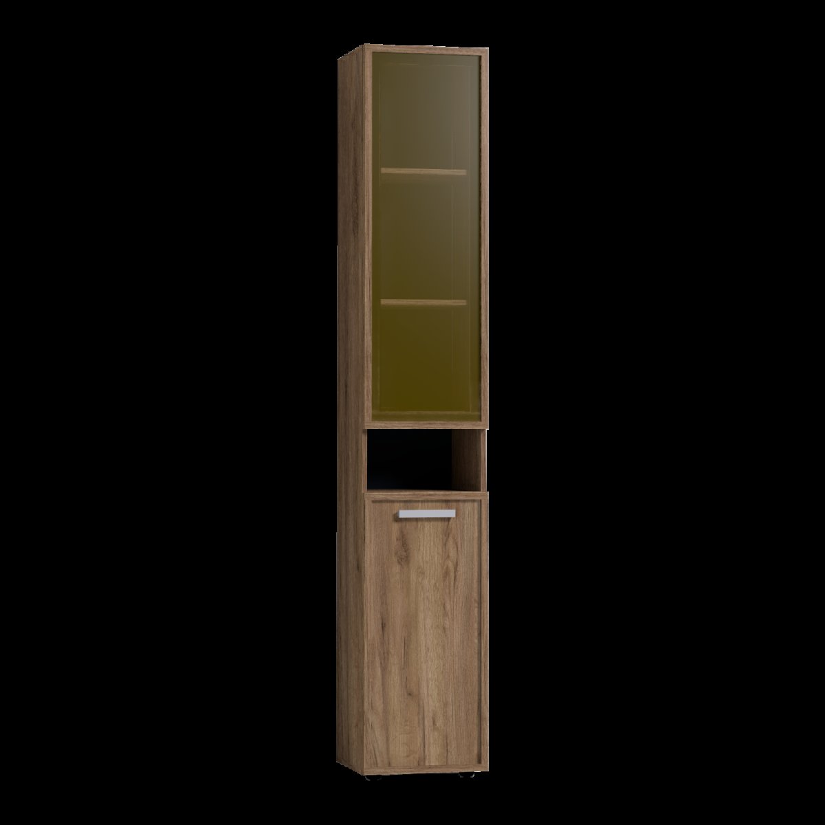 Высокий шкаф для хранения идеально подходит для комнаты подростков, в которой слишком много разнообразных и таких "нужных вещей". Верхний рамочный фасад с тонированным стеклом открывается за раму, нижний фасад Контур открывается за серую ручку из массива. Верхний и нижний фасады можно перенавесить на левую и на правую стороны.