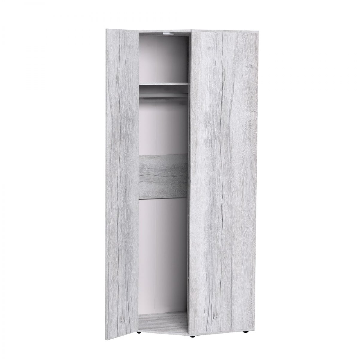 Угловой шкаф – это продуманное решение для того, чтобы организовать хранение даже в малогабаритном помещении. Шкаф из серии Neo вместит в себя деликатную одежду на плечиках, вещи в сложенном виде, коробки с аксессуарами, а также постельное белье. Встроенный беспроводной светодиодный светильник включается при открывании двери и помогает найти нужную вещь в темноте.
