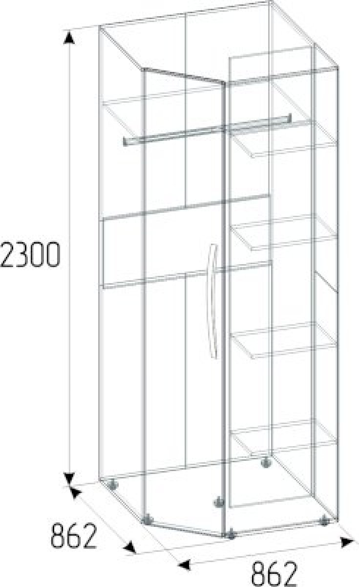 Отлично организовать пространство в маленькой спальне поможет угловой шкаф. Встроенная подсветка, стационарная штанга и полноценный стеллаж для белья внутри способствуют аккуратной организации вещей. Гладкие фасады и натуральный декор шкафа привнесут в комнату особый уют и теплоту. Шкаф обязательно крепится к стене на подвесы, а компенсировать неровности пола можно, благодаря регулируемым опорам.
