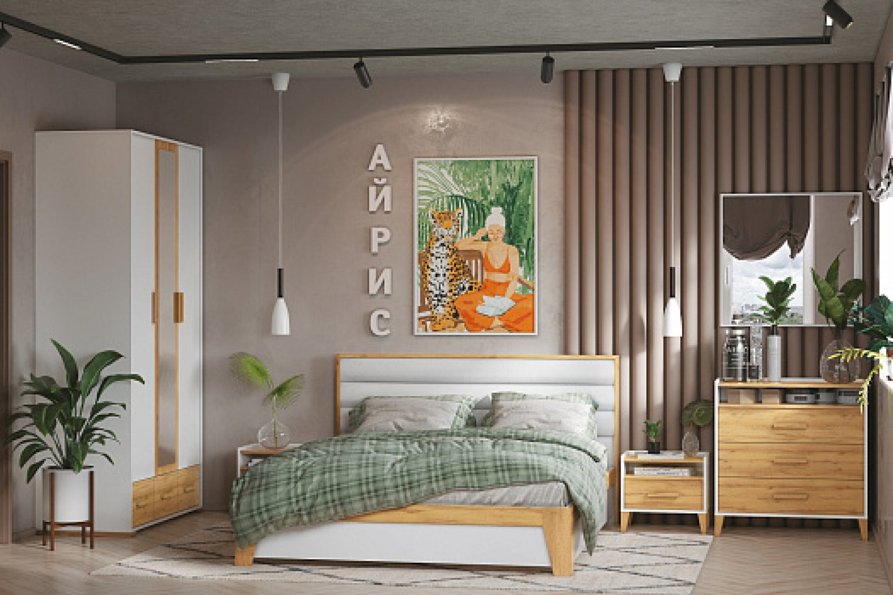 В модульной коллекции Айрис каждая деталь продумана до мелочей. Древесные фасады систем хранения как будто укутаны вбелоснежный цвет, в котором представлен корпус. Тонкие точеные опоры, деревянные ручки геометрической формы, использование зеркал на фасадах и разноплановое наполнение шкафов, долговечная фурнитура - еще не все преимущества Айрис. Мебель надежна, но совсем не массивна.Изготовлена из высококлассного ЛДСП класса эмиссии Е1, что гарантирует безопасность в процессе ежедневной эксплуатации. А кромка ПВХ по периметру изделий защитит их от деформации и продлит срок службы. Разнообразие модулей позволит Вам без труда собрать идеальный комплект и рационально организовать пространство спальни. Например, комплект 2 состоит из двуспальной кровати, двух прикроватных тумб, низкого комода с ящиками и шкафа для одежды и белья. Зеркало в комплект не входит.