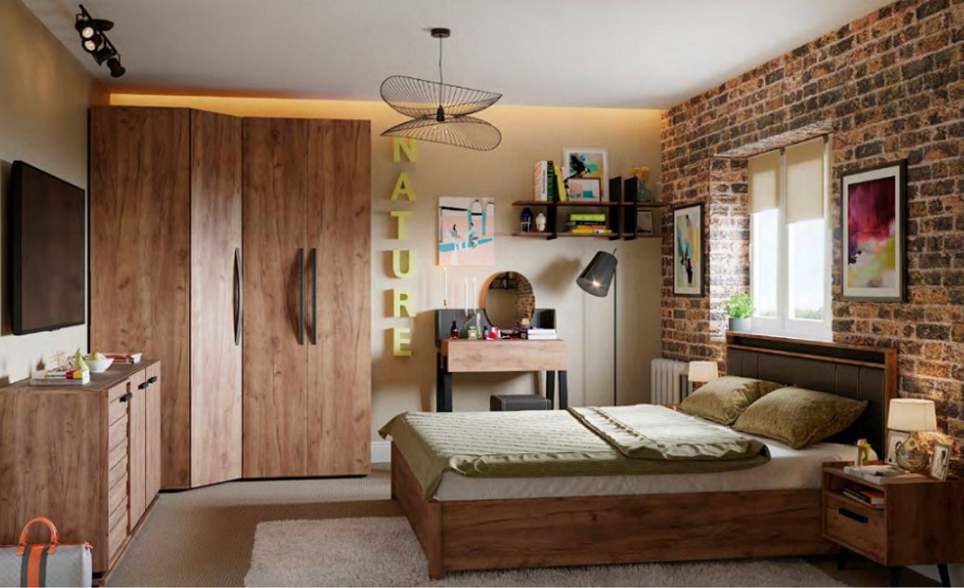 Теплота натурального дерева - это уже неретро, а ультрамодный шик!Древесный декор Дуб Табачный Craft и черная кожа идеально сочетаются вспальне NATURE. Cпальня изготовлена из ЛДСП Дуб табачный крафт, 16 мм,совершенно новое мягкое изголовье кроватей- в раме с чернойвинилискожей, с декоративной строчкой золотыми нитями.Простые прямые линии, отсутствие сглаженных углов и лишних изгибов придают спальне NATURE особую атмосферу стиля лофт.Изголовье в древесной раме, декоративная строчка золотой нитью на мягких подушечках кровати из черной экокожи – изюминка спальни NATURE. Максимально рационально использовать квадратные метры спальнипозволит подъемное основание, которое идет в комплекте с кроватью. Благодаря газлифтам, основание поднимается без усилий и обеспечивает доступ к вместительному внутреннему коробу, изолированному от пыли.
