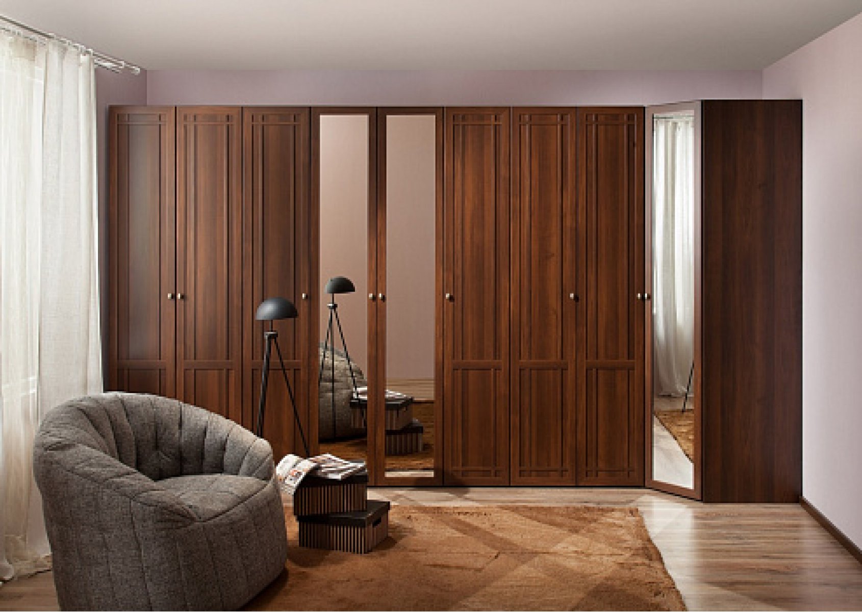 Классическая спальня Sherlock - настоящее украшение интерьера и воплощение изящества Вашей квартиры. Мебель выполнена из высококлассного ЛДСП и МДФ в декоре, имитирующем текстуру натурального дерева. Разноплановое наполнение модулей, несколько вариантов кроватей шириной от 90 до 180 см, шариковые направляющие плавного и бесшумного выдвижения на ящиках, стильная лицевая фурнитура - это еще не все преимущества, которыми обладает коллекция. Благодаря разнообразию модулей Вы можете подобрать комплект, идеально подходящий именно Вам! Например, комплект 4 выполнен в декоре "орех шоколадный" и состоит из просторной двуспальной кровати с основанием в комплекте, двух узких тумб, вместительного шкафа с комбинированным зеркалом фасадом, туалетного стола и трюмо.