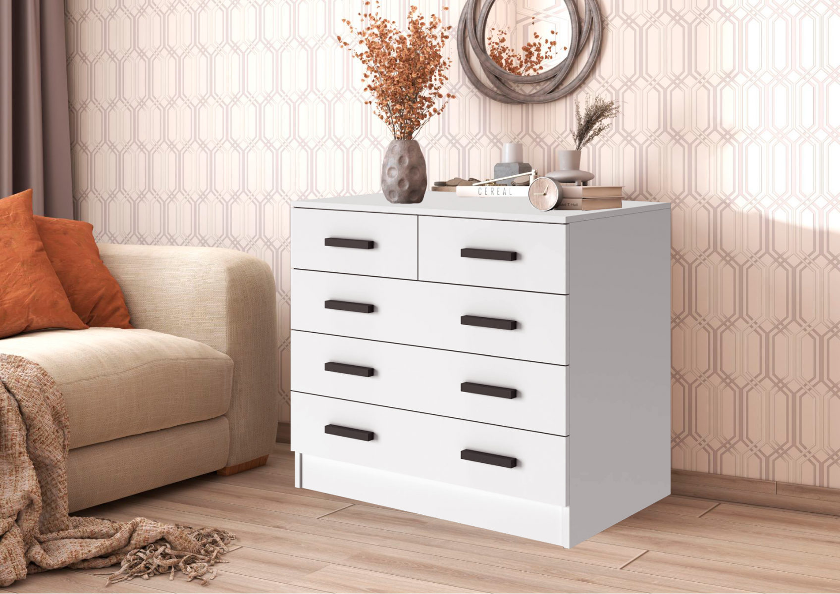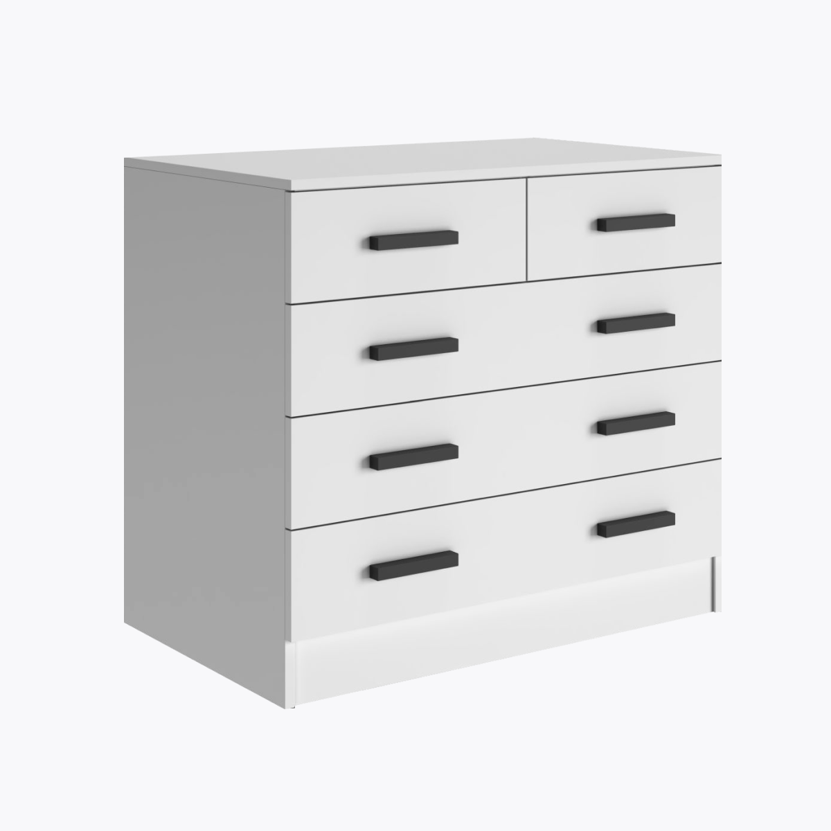 Комод Бостон 3+2 ящика в белом цвете, выполнен из качественного ЛДСП с ручками из МДФ черного цвета. Данная модель комода подойдет даже для небольшой спальни, при этом пять объемных ящиков вместят белье и другие предметы гардероба. Надежная столешница комода может быть использована в качестве ТВ подставки или подставки для комнатных растений. Комод оснащен направляющими шариковыми, полного выдвижения. Легкая сборка – также является преимуществом наших изделий, для сборки потребуется только отвёртка и шестигранник. Комод в белом цвете подходит для любых комнат: для гостиной, спальни, детской комнаты, прихожей.