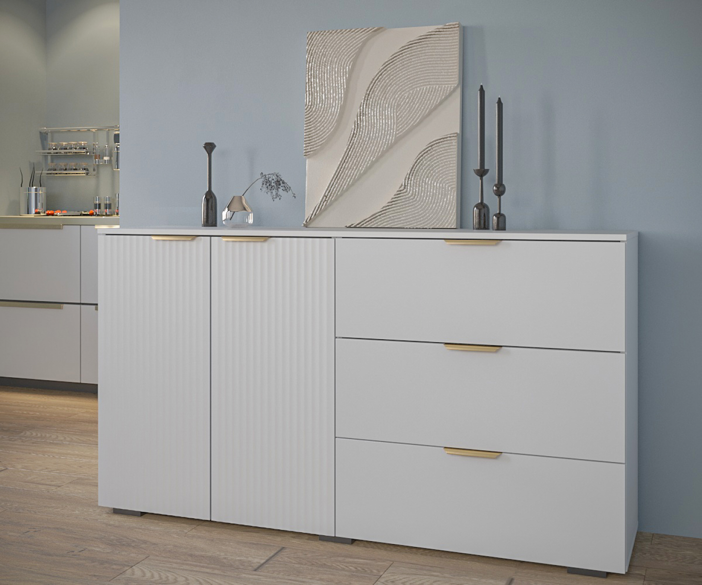 Комод Фиеста имеет 2 дверки+3 ящика, и отлично впишется в спальню, гостиную, прихожую - а также может использоваться в офисе. Надежная столешница комода может быть использована в качестве ТВ подставки или подставки для комнатных растений.