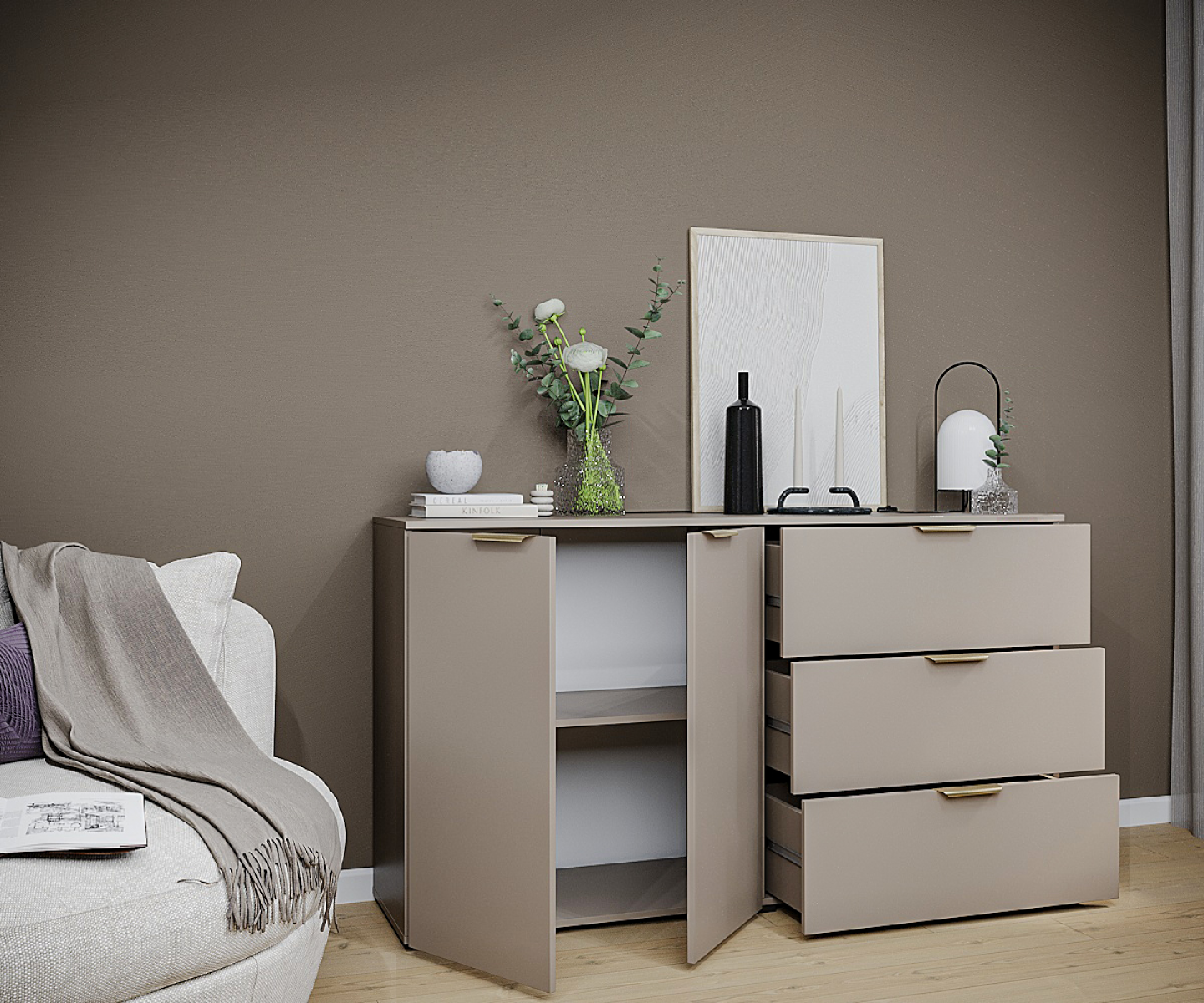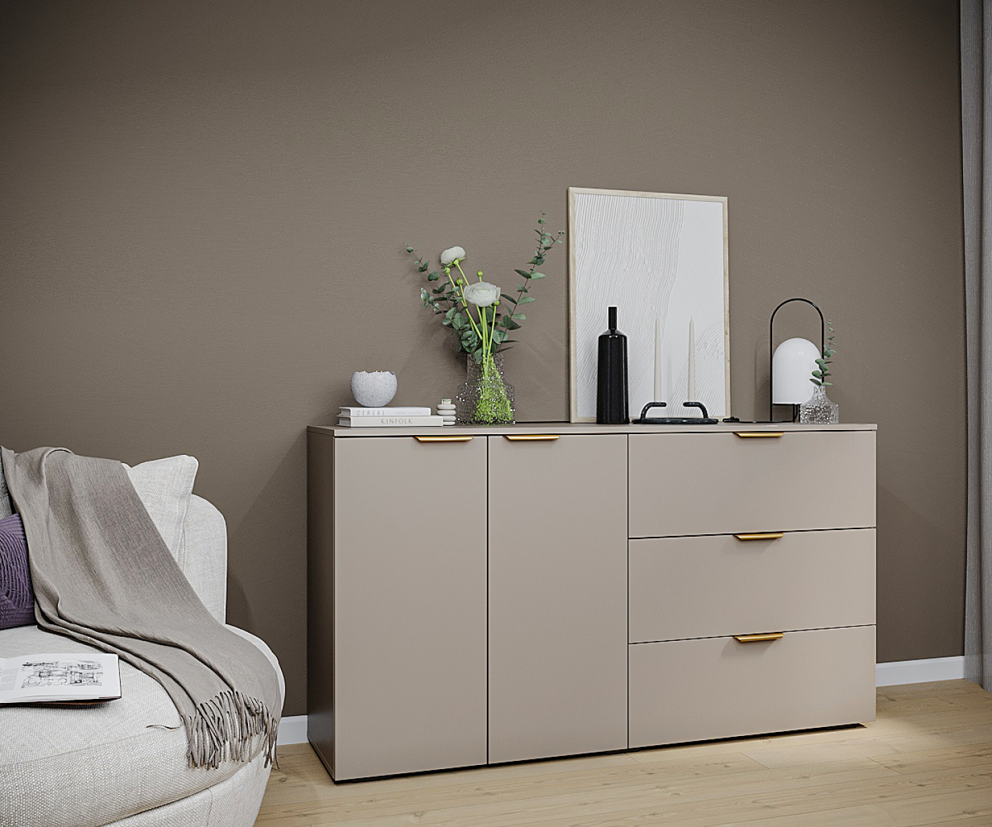 Комод ГОЛД Бостон 2 дверки+3 ящика отлично впишется в спальню, гостиную, прихожую - а также может использоваться в офисе. Комод выполнен в глиняно сером цвете. Надежная столешница комода может быть использована в качестве ТВ подставки или подставки для комнатных растений.