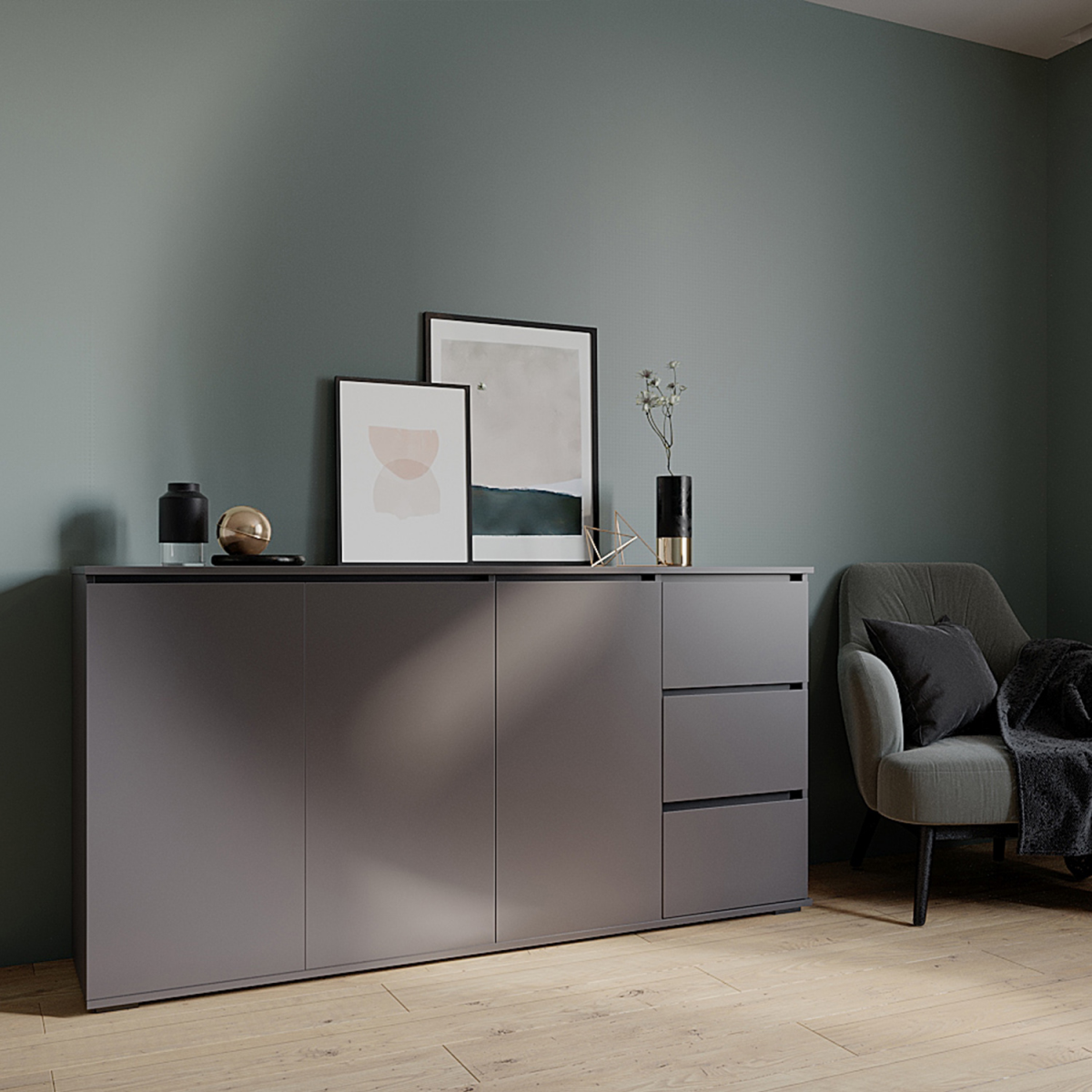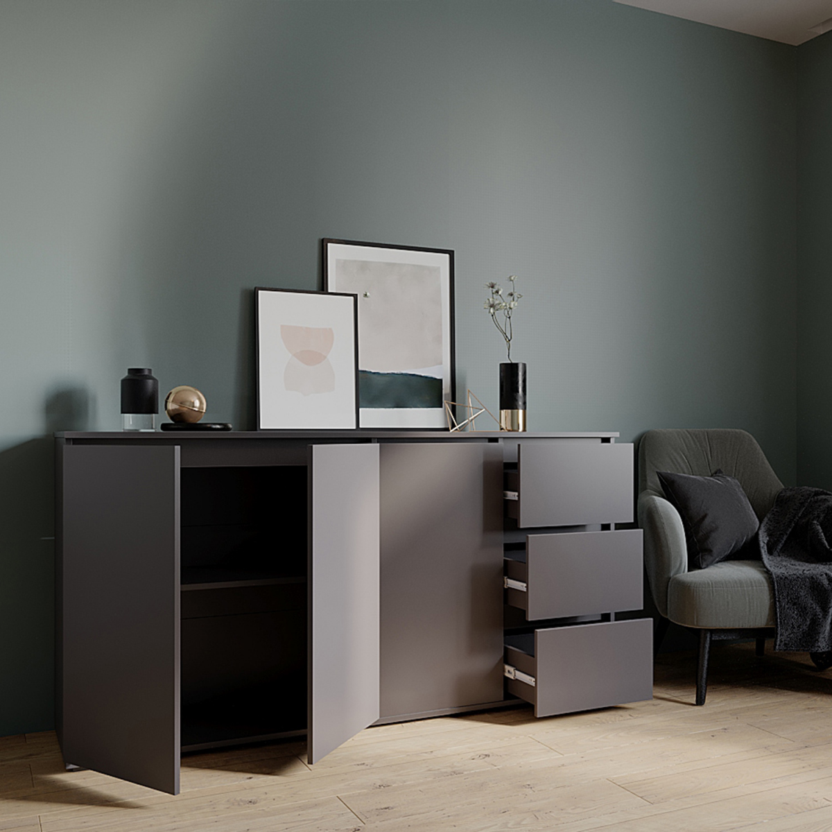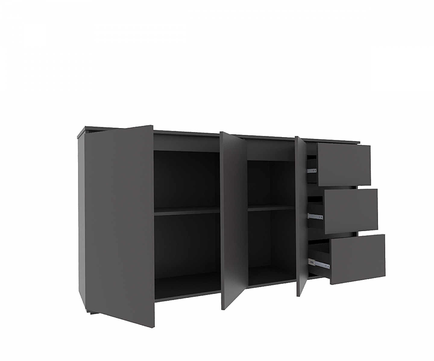 Широкий комод Сура 1704 наполнен 6-ю ящиками изготовлен из высококачественного ЛДСП, с функционалом тумбы под ТВ, имеет вместительный ящик на шариковых направляющих и полки за створками дверей. Камод выполнен полностью в цвете -Графит. Размеры комода: 1704*770*400 (ШхВхГ). Петли без доводчиков. Зона хранения ящиков: 350х350х140. Инструкция и вся необходимая фурнитура предусмотрена в комплекте.