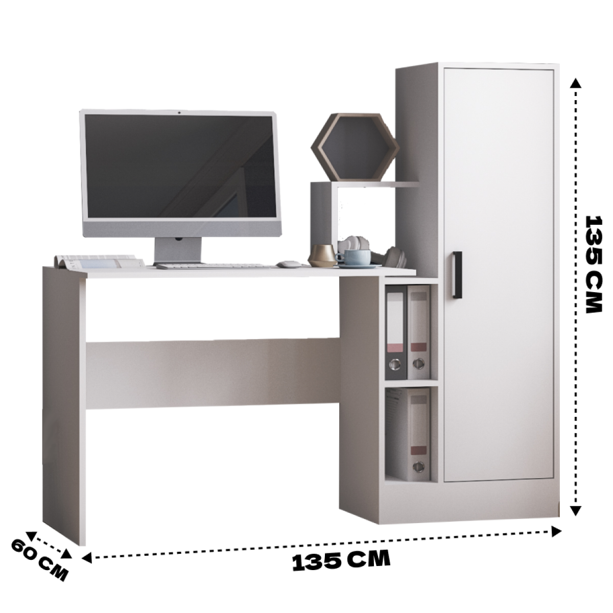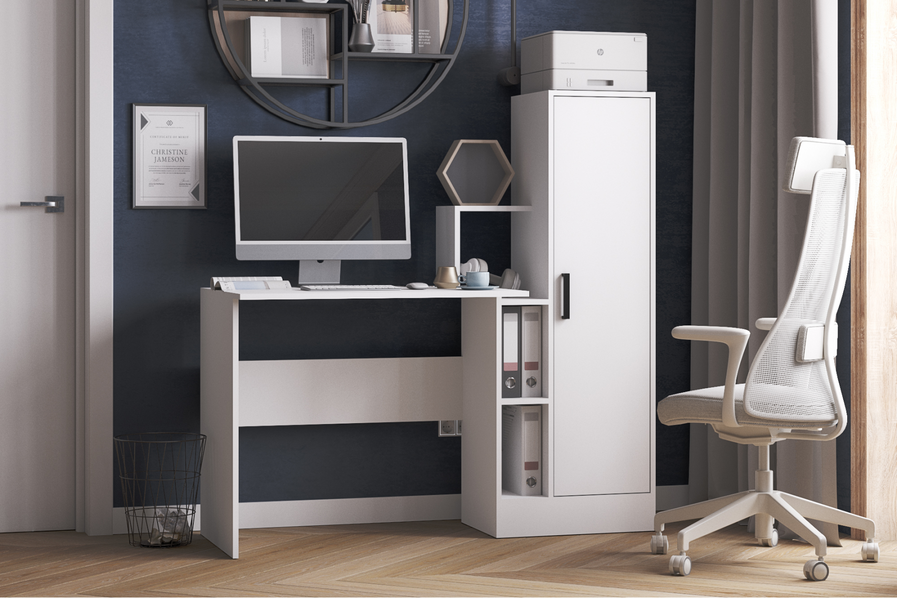Компьютерный стол СКМ-2 в белом цвете с невысоким пеналом и полками, сочетает рабочую зону и вместительную зону хранения. Рабочее место для школьника или взрослого всегда будет выглядеть аккуратным, пенал в дверкой спрячет все книги и бумаги от посторонних глаз. Сборка как на фото, не универсальный. Размер стола: 135х1350х600 (ШхВхГ). Стол СКМ-2 безопасен для детей и пригоден для детской . Сборка стола легка и интуитивно понятна.Инструкция и вся необходимая фурнитура предусмотрена в комплекте.