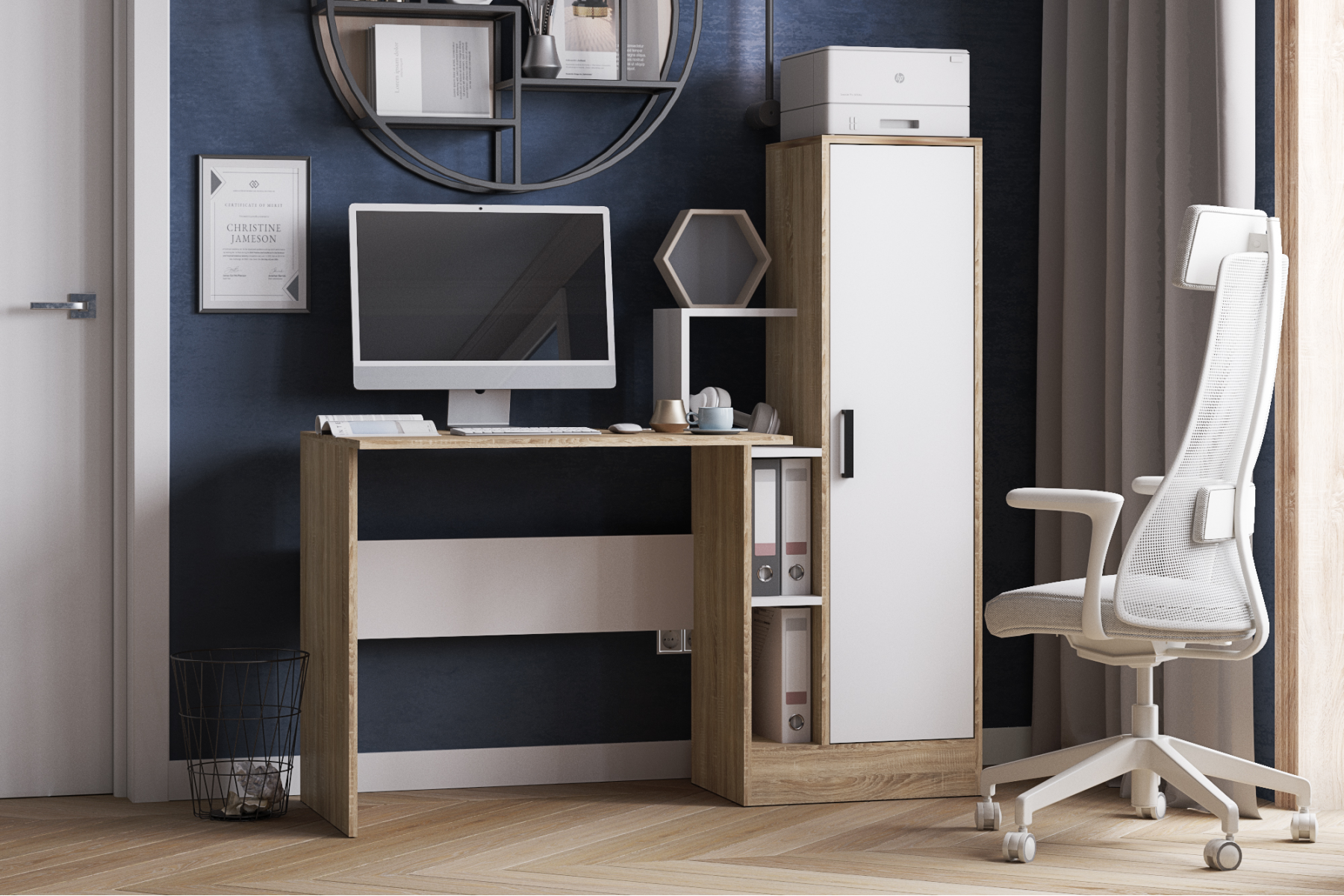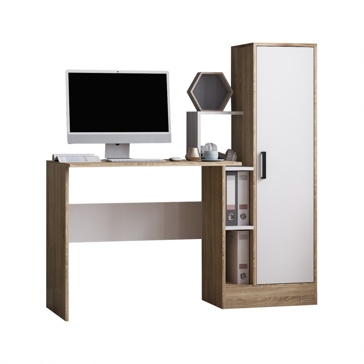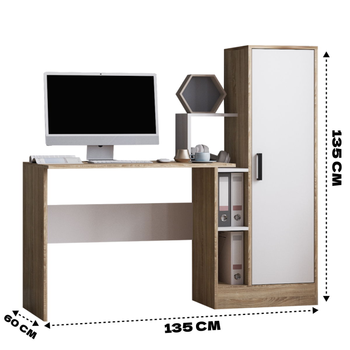 Стол в цвете "Дуб Сонома/Белый" с пеналом может заменить полноценное рабочее место для школьника или взрослого. Шкаф-пенал спрячет от посторонних глаз документы и канцелярские принадлежности, игрушки и др. мелочи. Полка для мелочей выполнит роль подставки для органайзера или небольших книг. Письменный стол также можно использовать как компьютерный стол, а ниша с полками сбоку будет дополнительным местом для хранения папок и мелочей. Компьютерный стол станет любимым рабочим местом для ребенка. Деревянный стол имеет оптимальные размеры, при относительно небольших габаритах.Размер стола: 1350х1350х600 (ШхВхГ). Инструкция и необходимая фурнитура включена в комплект.