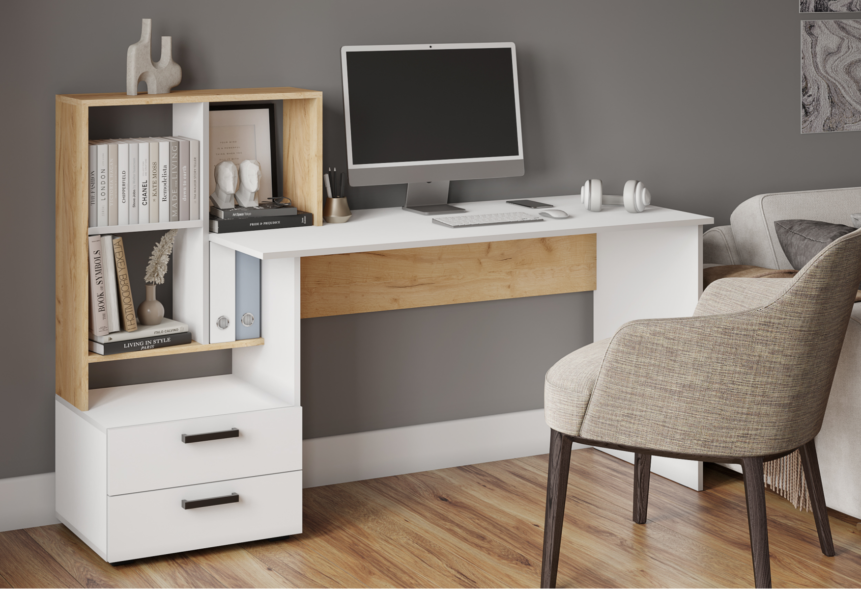 Компьютерный угловой стол СКМ - 5 с тумбой 2 ящика и невысокой надставкой с полками выполнен в двух современных цветах - Дуб крафт золотой/Белый.Данная модель стола сочетает рабочую зону и вместительную зону хранения. Отличное рабочее место для школьника или взрослого. Изготовлен из экологически безопасного ЛДСП. Безопасен для детей и пригоден для детской . Сборка стола легка и интуитивно понятна. Деревянный стол имеет оптимальные размеры, при относительно небольших габаритах.Размер стола: 1648х1105х600(ШхВхГ). Инструкция и необходимая фурнитура включена в комплект.