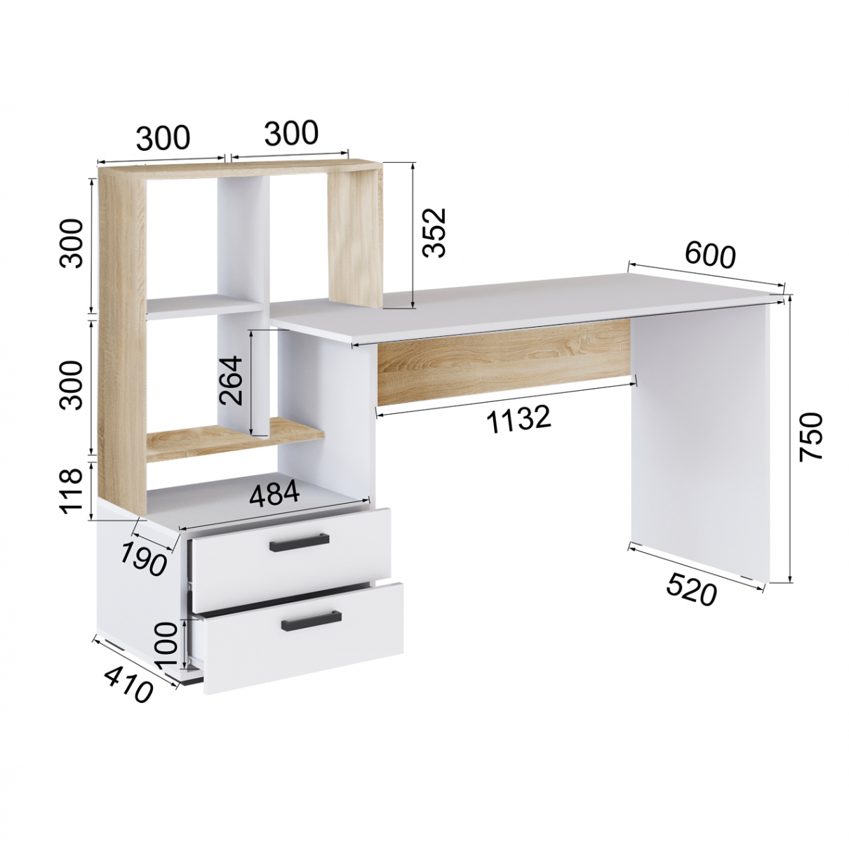 Компьютерный угловой стол СКМ - 5 с тумбой 2 ящика и невысокой надставкой с полками выполнен в двух современных цветах - Дуб сонома/Белый.Данная модель стола сочетает рабочую зону и вместительную зону хранения. Отличное рабочее место для школьника или взрослого. Изготовлен из экологически безопасного ЛДСП. Безопасен для детей и пригоден для детской . Сборка стола легка и интуитивно понятна. Деревянный стол имеет оптимальные размеры, при относительно небольших габаритах.Размер стола: 1648х1105х600(ШхВхГ). Инструкция и необходимая фурнитура включена в комплект.