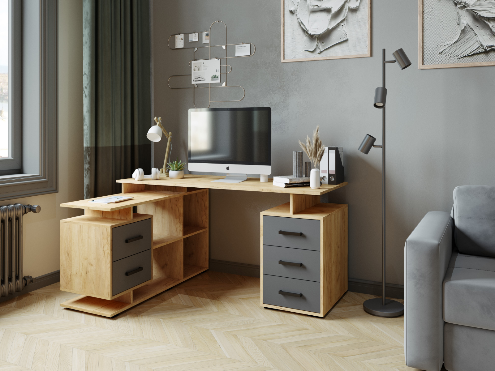 Стол письменный/компьютерный угловой СКМУ-3 выполнен в цвете дуб крафт золотой с фасадами графит серый. Открытые ниши углового стола являются удобной зоной хранения, тумбы с ящиками слева и справа отлично вмещают документы, учебники и др. Стол угловой письменный подойдет как для школьника, так и для рабочего места взрослого, можно использовать как офисную мебель. Сборка стол как на фото, не универсальная. Инструкция и вся необходимая фурнитура предусмотрена в комплекте.