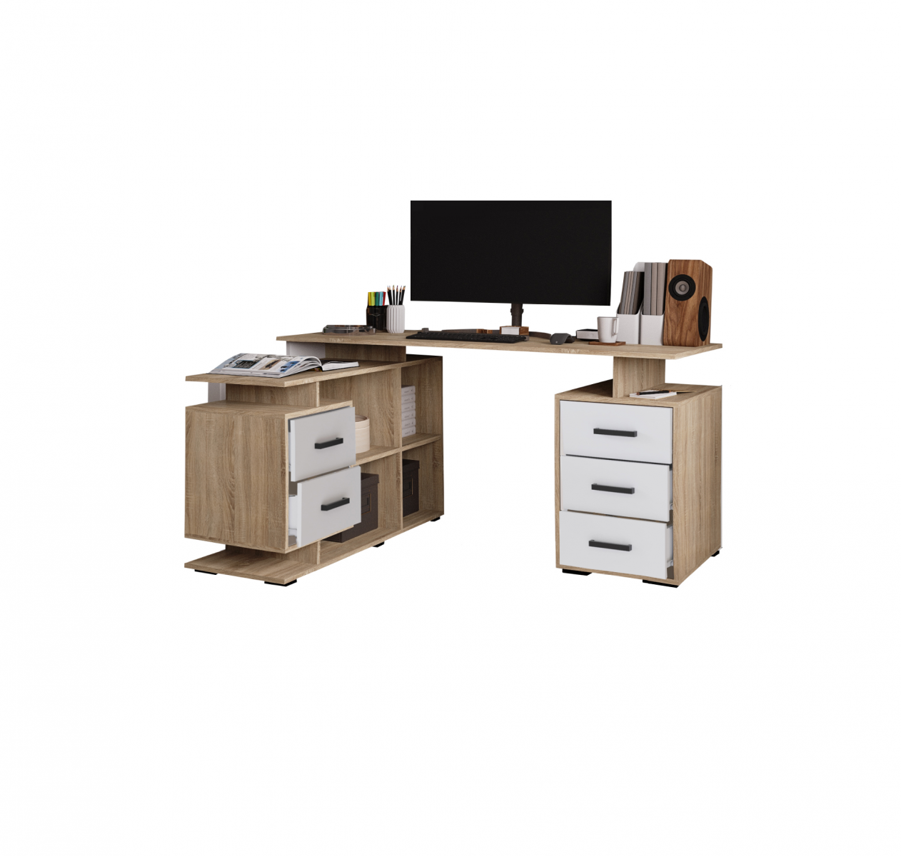Компьютерный угловой стол СКМУ-3 выполнен в текстурном белом оттенке. Открытые ниши углового стола являются удобной зоной хранения, тумбы с ящиками слева и справа отлично вмещают документы, учебники и др. Компьютерный угловой стол подойдет как для школьника, так и для рабочего места взрослого, можно использовать как офисную мебель. Сборка стол как на фото, не универсальная. Стол выполнен в двух оттенка Дуб сонома/Белый. Изготовлен из экологически безопасного ЛДСП. Безопасен для детей и пригоден для детской . Сборка стола легка и интуитивно понятна. Деревянный стол имеет оптимальные размеры, при относительно небольших габаритах.Размер стола: 1500х750х1100 (ШхВхГ). Инструкция и необходимая фурнитура включена в комплект.