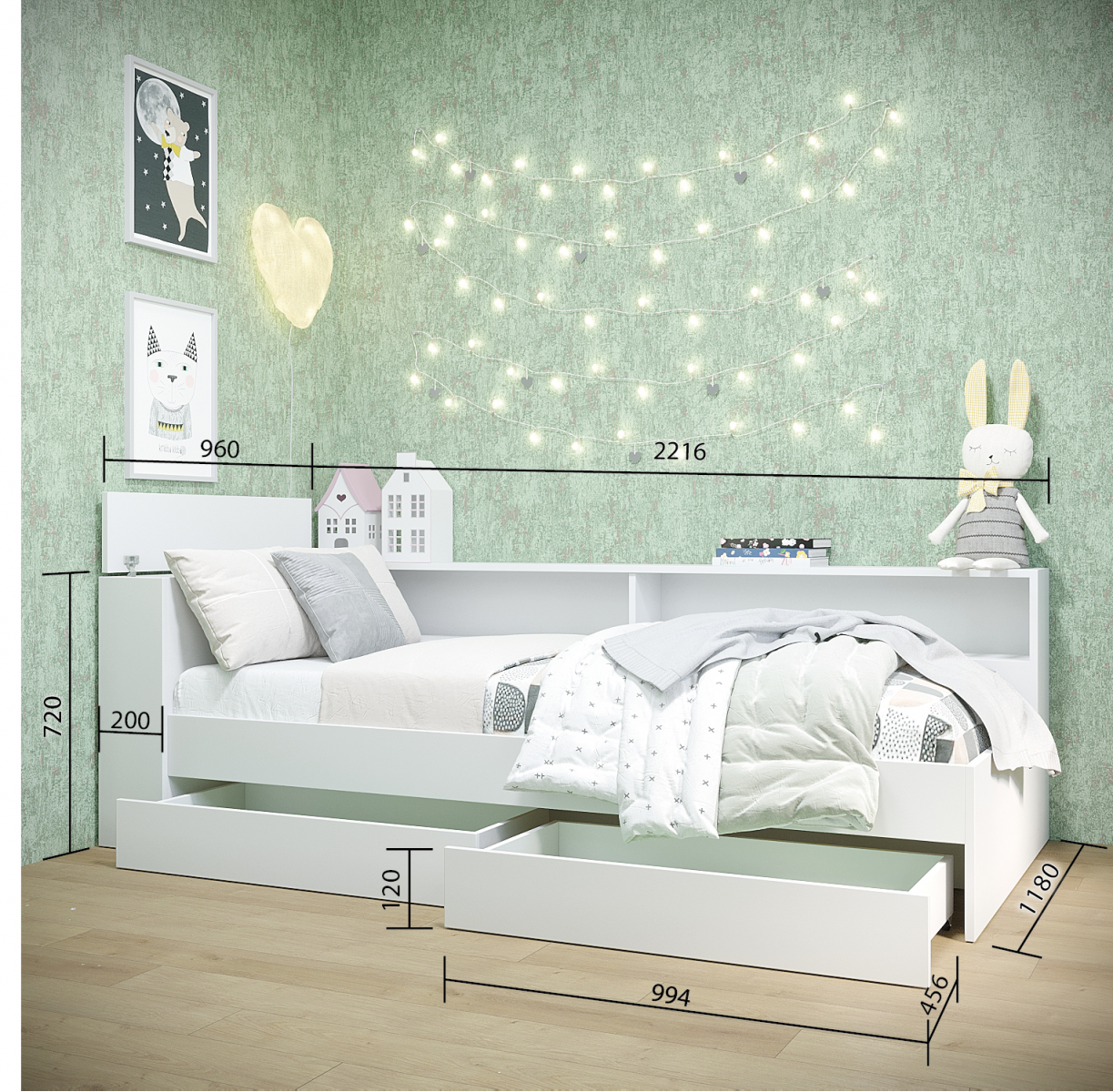 Кровать «Ксения» — это отличное решение для детской или подростковой комнаты. Кровать выполнена в белом цвете, имеет два ящика внизу и ящик в изголовье,.