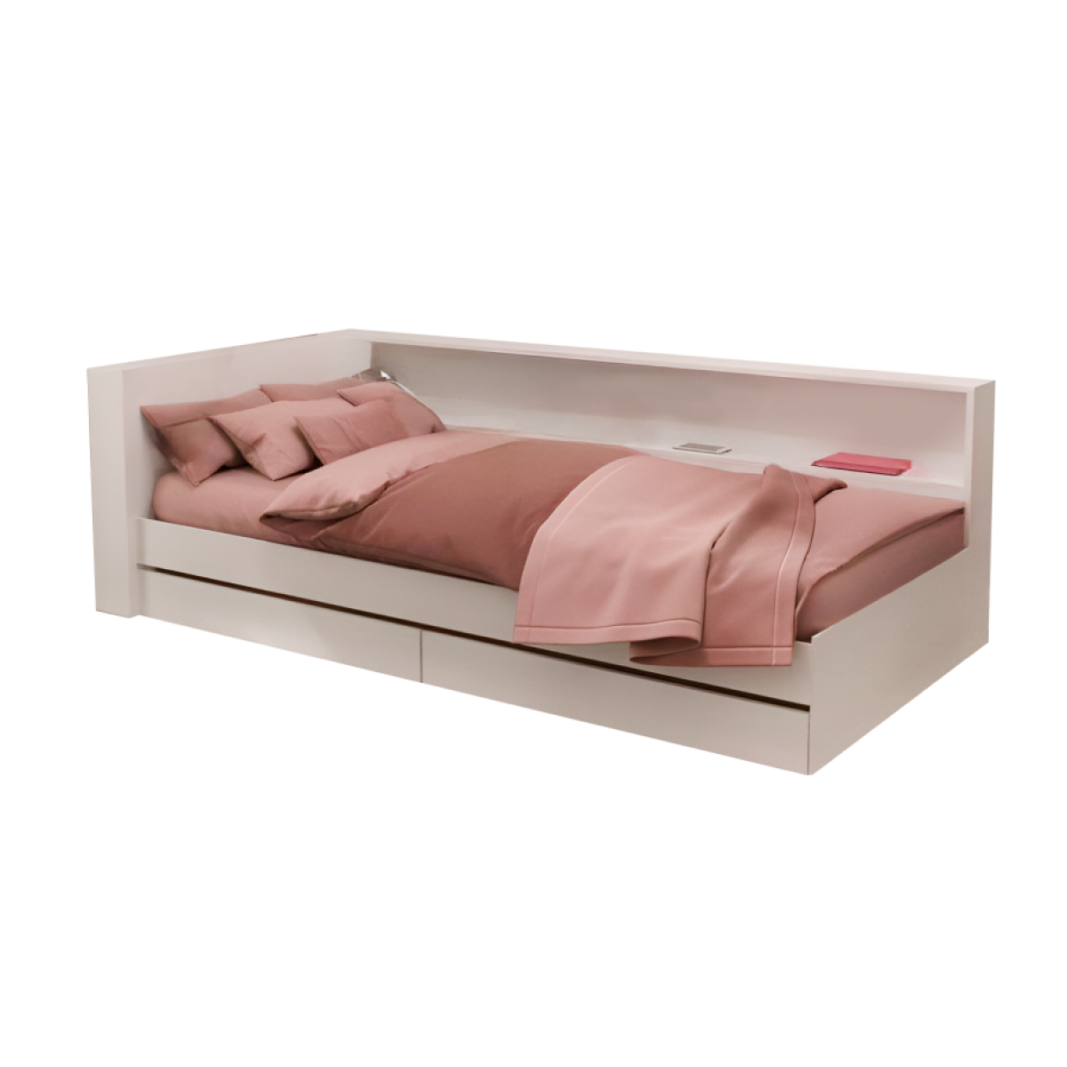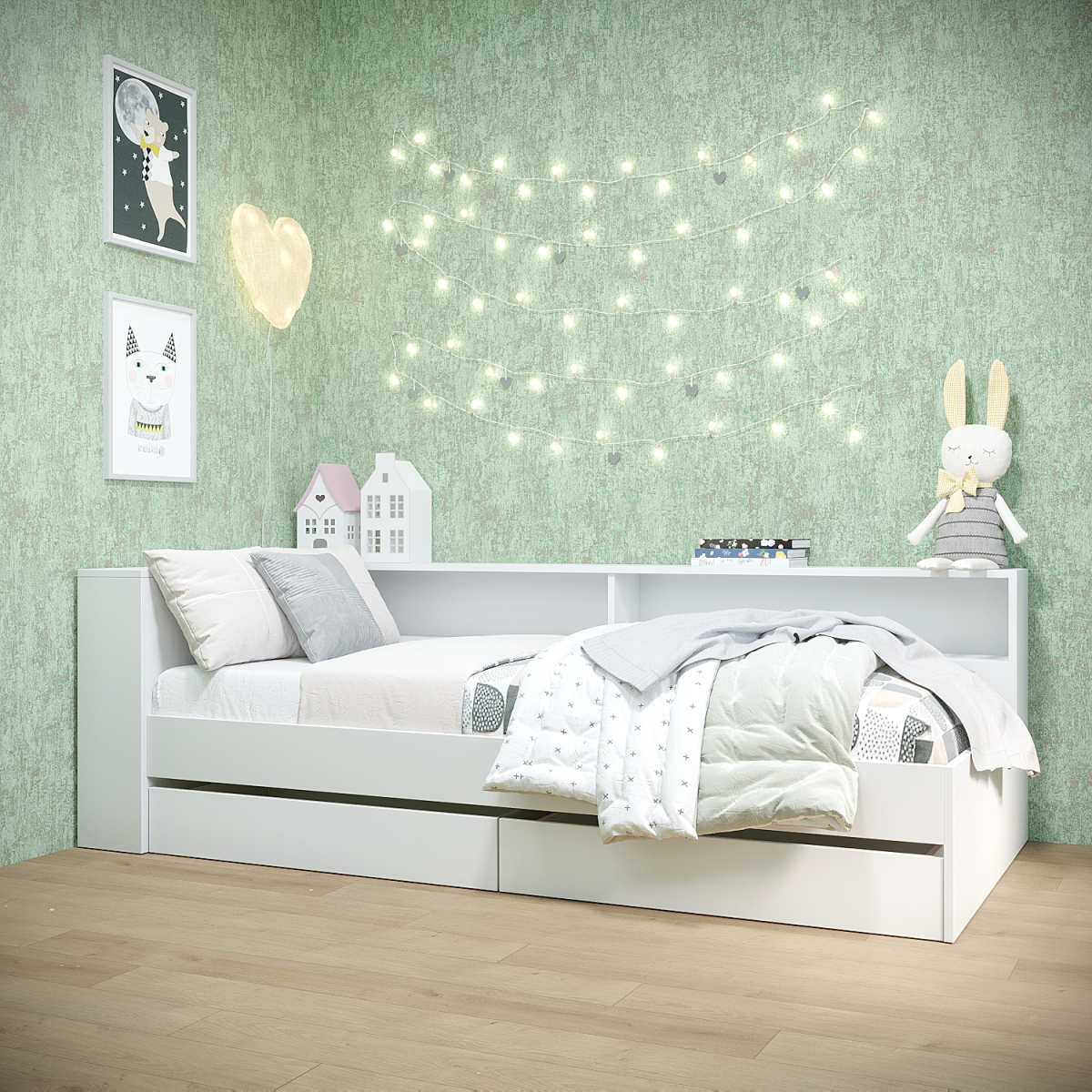 Боковой прикроватным блок, можно установить с любой стороны в соответствии с Вашими предпочтениями. Данная конструкция может служить не только для хранения вещей, но и для зонирования пространства, так как она имеет не высокую перегородку. Ящик в изголовье кровати с откидной крышкой - дополнительная зона хранения для пледа, запасной подушки и других вещей, которые необходимо спрятать от посторонних глаз. Благодаря своим размерам и функциональности, этот спальный набор станет отличным выбором для комнаты ребенка или подростка, а также для взрослого человека. Ящики кровати сделаны на колесных опорах, что позволяет их перемещать по комнате, облегчая уборку помещения.