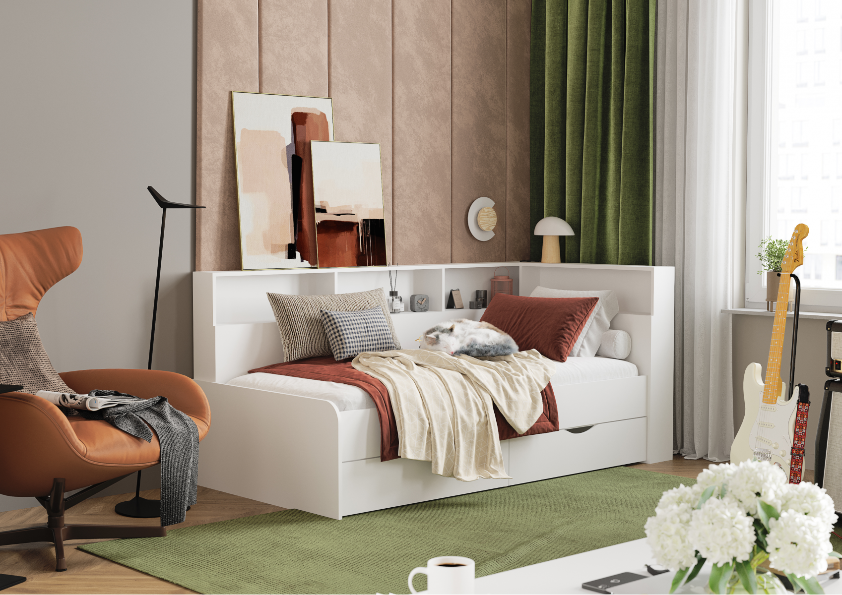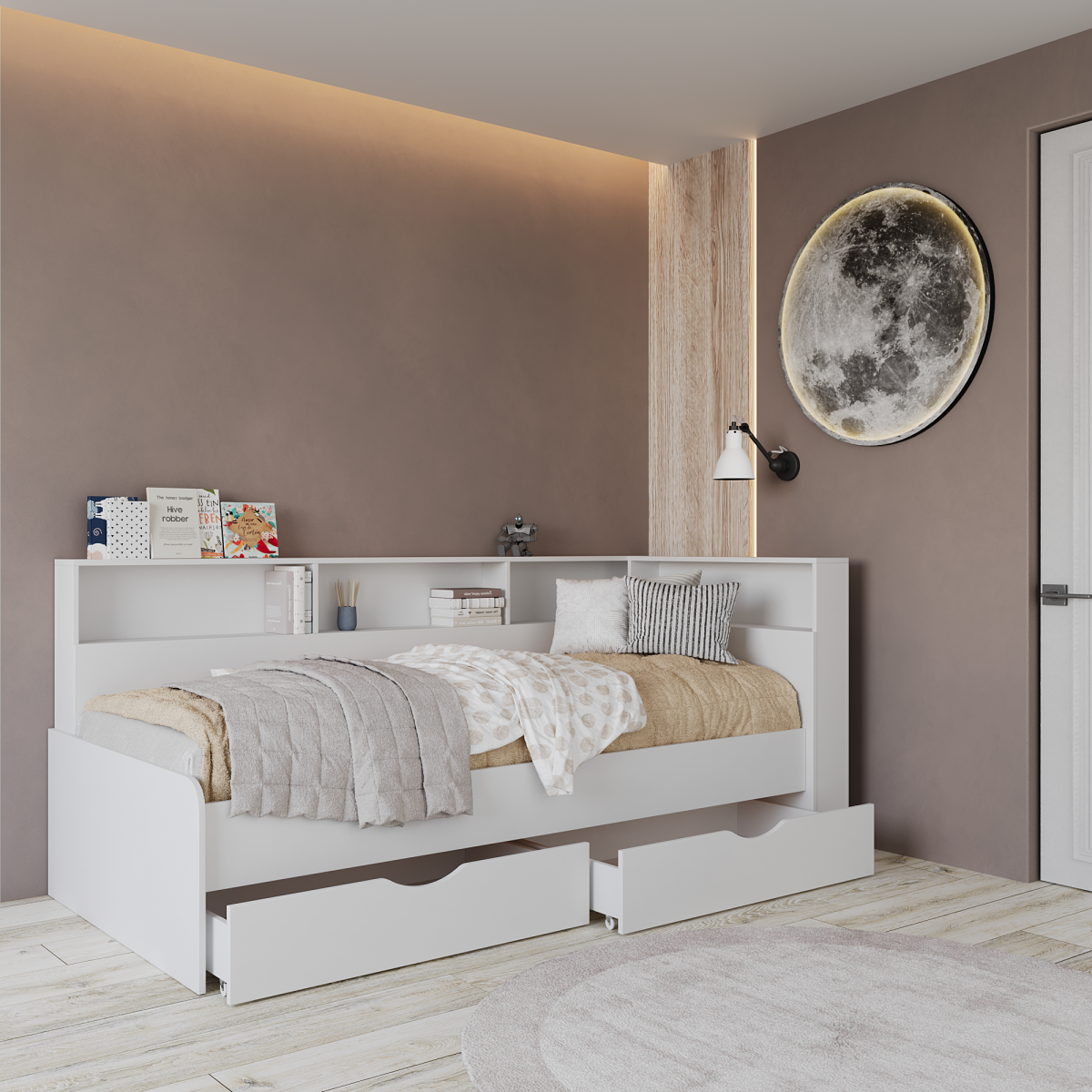 Односпальная кровать идеально подходит для отдыха одного человека, обеспечивая необходимое пространство для комфортного сна и отдыха. Данный набор идеально впишется в детскую комнату или подростковую спальню. Это прекрасный выбор для тех, кто ценит комфорт, стиль и функциональность. Эстетическая привлекательность, практичность и универсальность делают его идеальным решением для создания уютной и стильной спальной комнаты.
