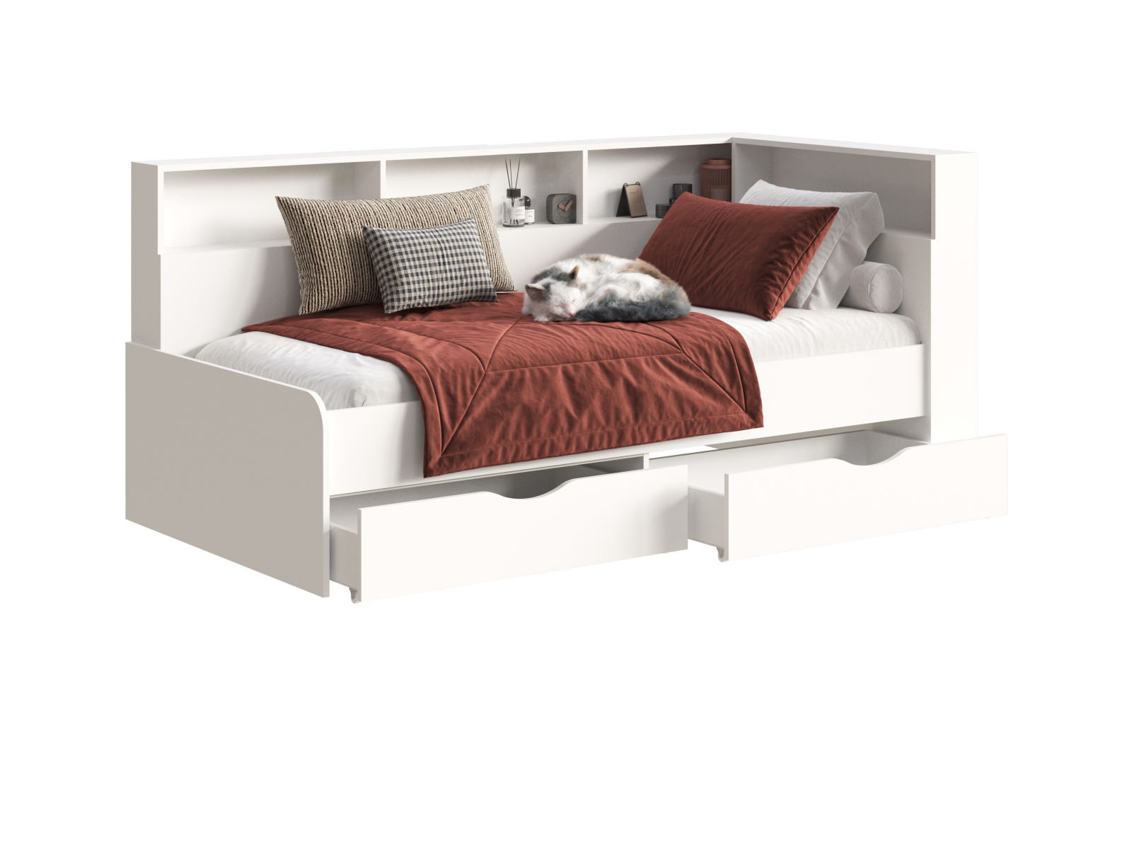 Стильная кровать «Юта» - идеальное решение для организации пространства и добавления нотки современности в комнату. Ее элегантный дизайн сочетает в себе функциональность и эстетику, предоставляя удобство хранения и украшения в одном. С интегрированными полками Вы сможете легко разместить свои любимые книги, фоторамки, коллекции и другие предметы, создавая яркий и персональный интерьер. Корпус и фасад кровати выполнен из ЛДСП в Белом цвете.