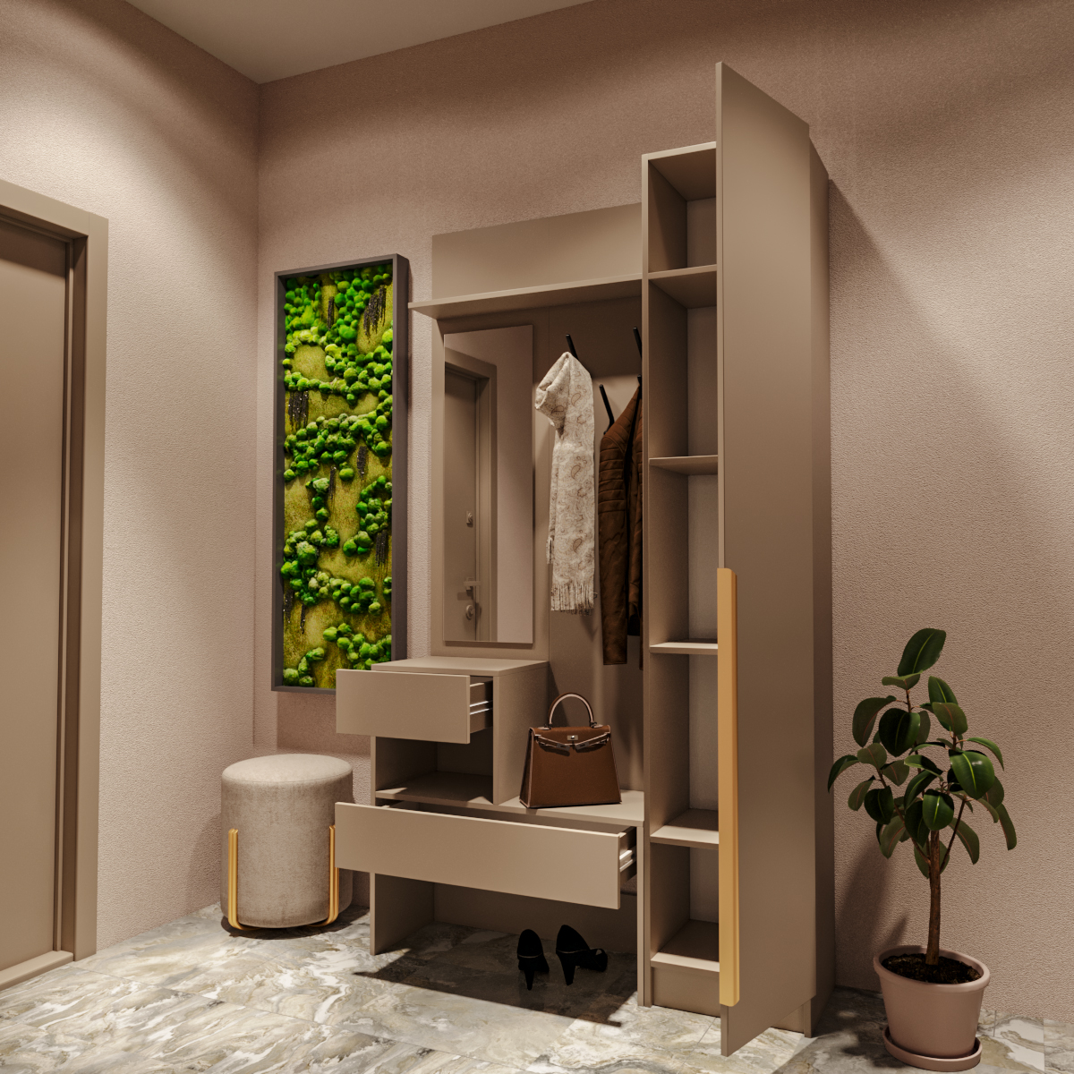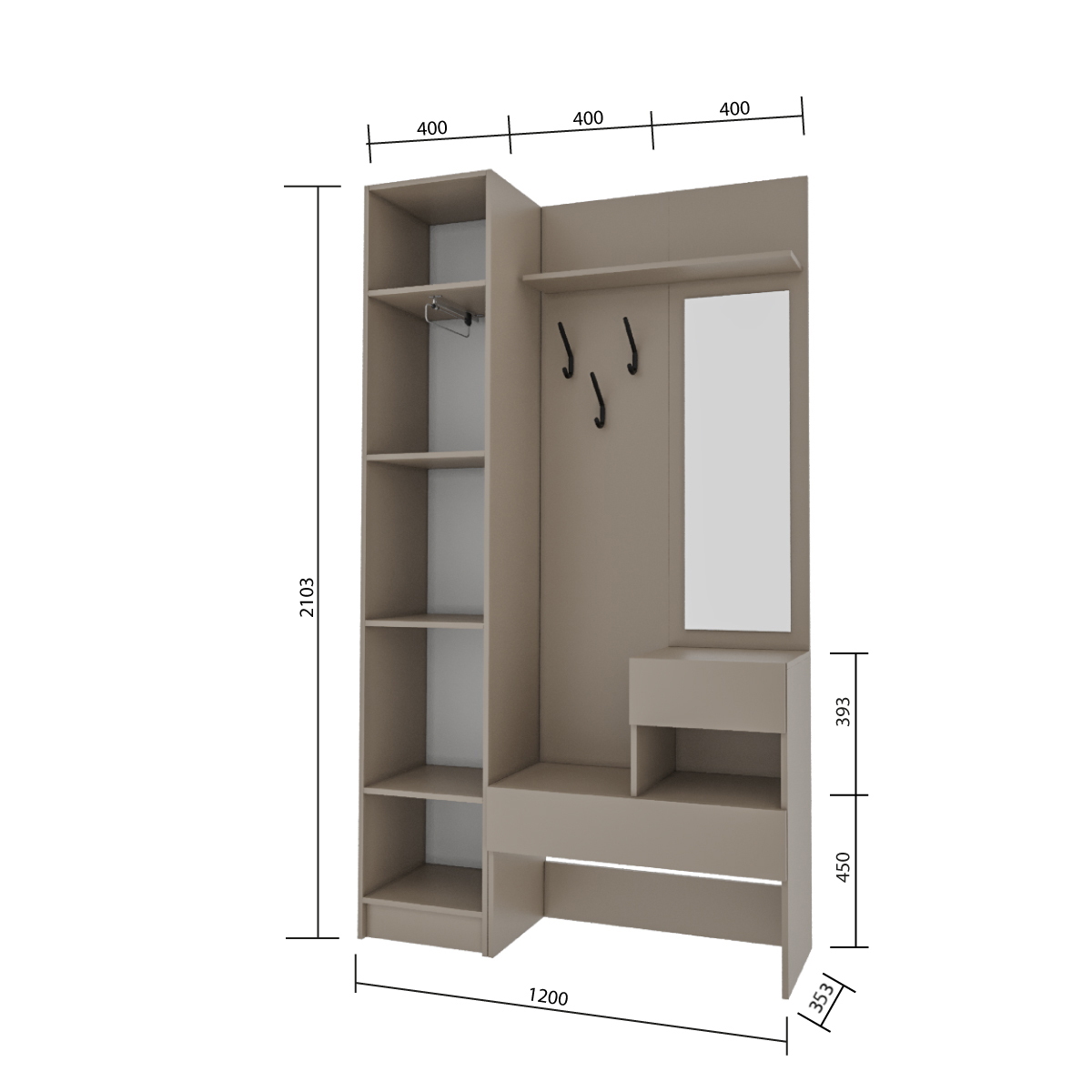 Прихожая из модульной программы «Голд Бостон» в наполнении пенала и вешалки "Голд Бостон В-1" зеркалом и тумбой с выдвижным ящиком имеет компактные размеры, прихожая не займет много места в вашей квартире, но при этом обеспечит достаточно места для хранения верхней одежды, обуви и других вещей.