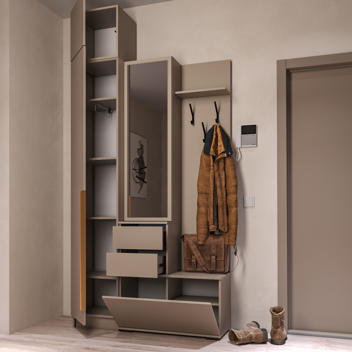 В нижней часть секции имеет отделение с откидной дверкой для обуви. На панелях вешалки 3 крючка черного цвета. За зеркалом расположены дополнительные полочки. Верхняя часть секции также имеет открытую полку.