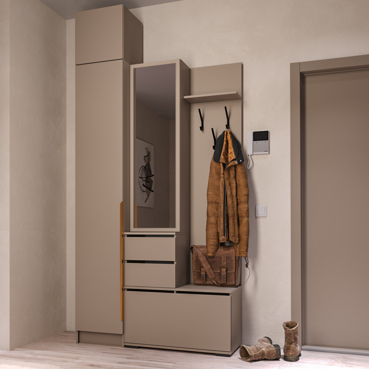 Прихожая из модульной программы «Голд Бостон» в наполнении пенала, антресоли и вешалки "Голд Бостон В-2" с зеркалом и тумбой с 2-мя выдвижными ящиками имеет компактные размеры.