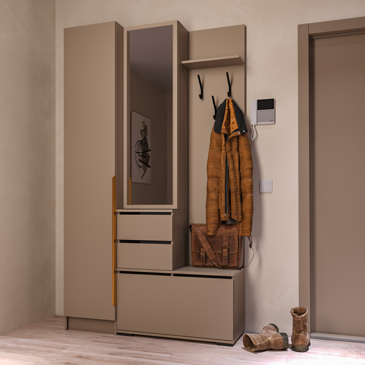 Прихожая из модульной программы «Голд Бостон» в наполнении пенала и вешалки "Голд Бостон В-2" с зеркалом и тумбой с 2-мя выдвижными ящиками имеет компактные размеры.