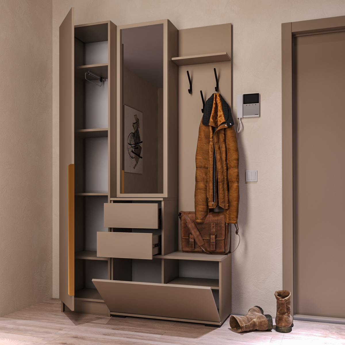В нижней часть секции имеет отделение с откидной дверкой для обуви. На панелях вешалки 3 крючка черного цвета. За зеркалом расположены дополнительные полочки. Верхняя часть секции также имеет открытую полку.