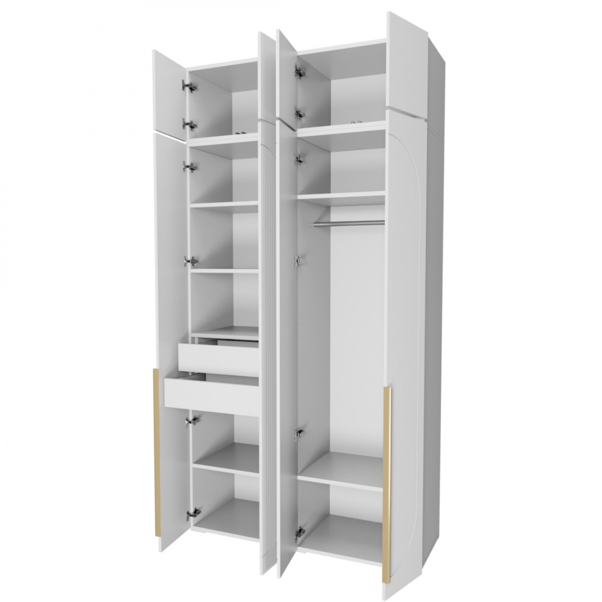 Шкаф оснащен металлическими ручками, петлями с доводчиками и шариковыми направляющими.
