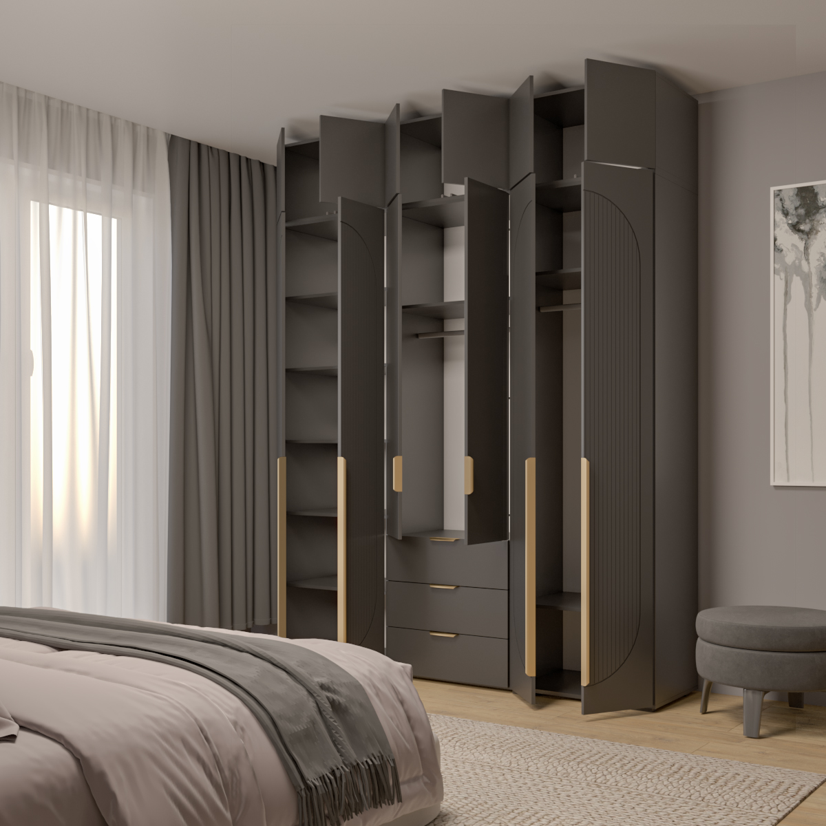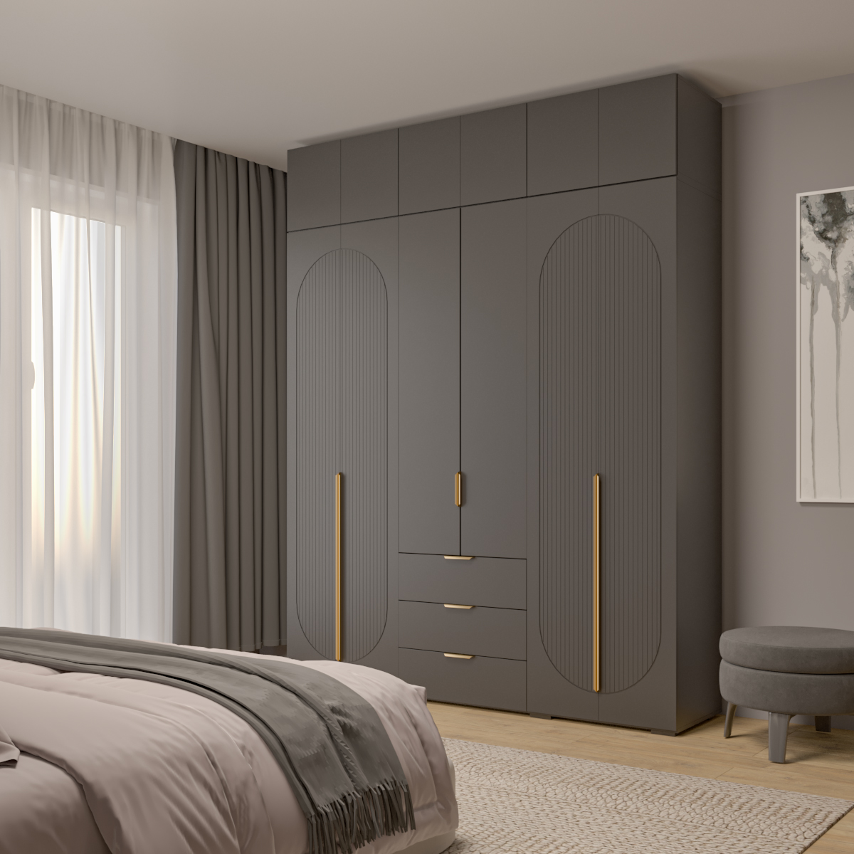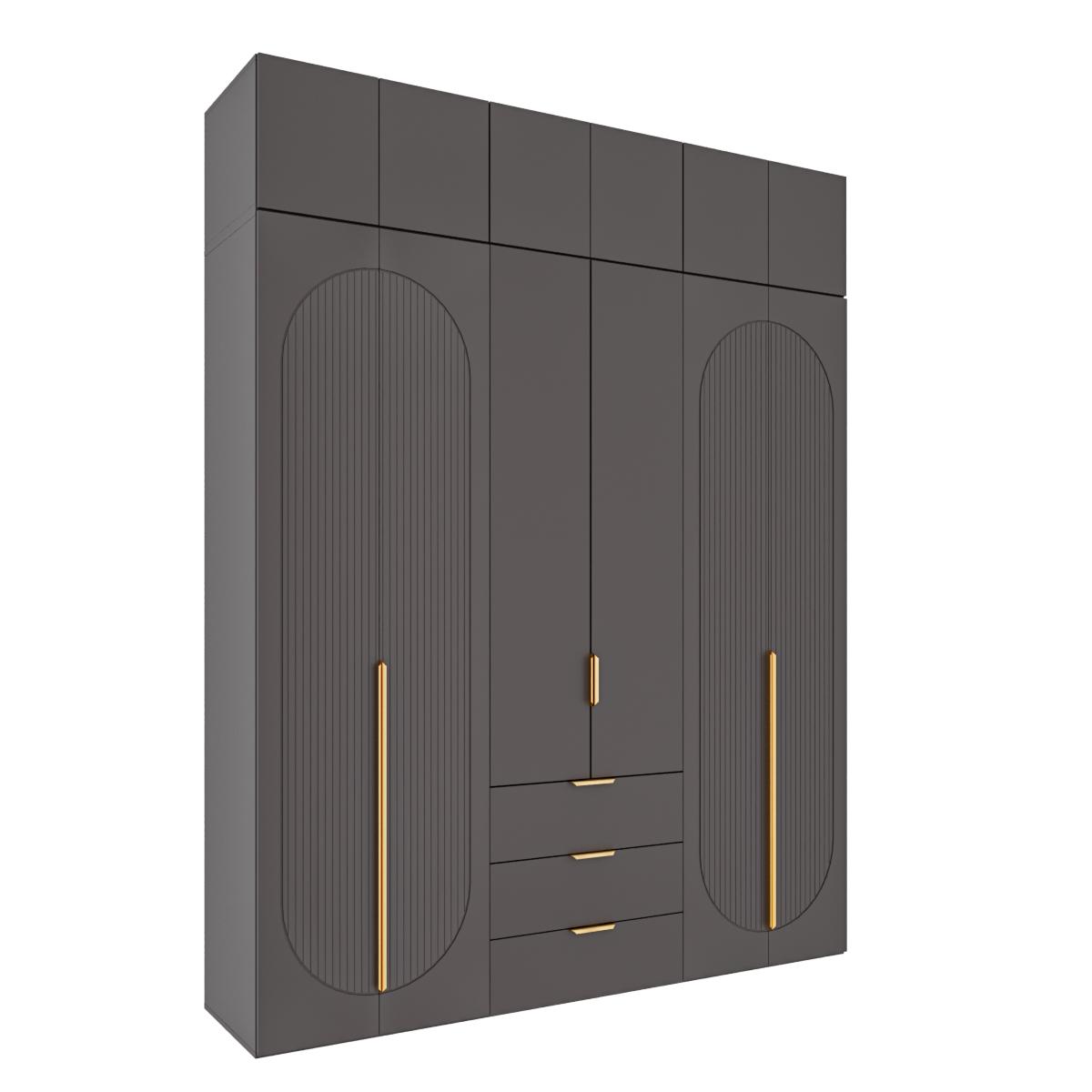 Шкаф "Фиеста" с фасадами из МДФ в элегантном оттенке "Графит софт" и корпусом из прочного ЛДСП – идеальное решение для организации хранения в спальне или прихожей. Этот вместительный, 6-ти створчатый распашной шкаф с габаритами 200×220×50 см (ШхВхГ) предлагает оптимальное сочетание элегантного дизайна и практичной функциональности.