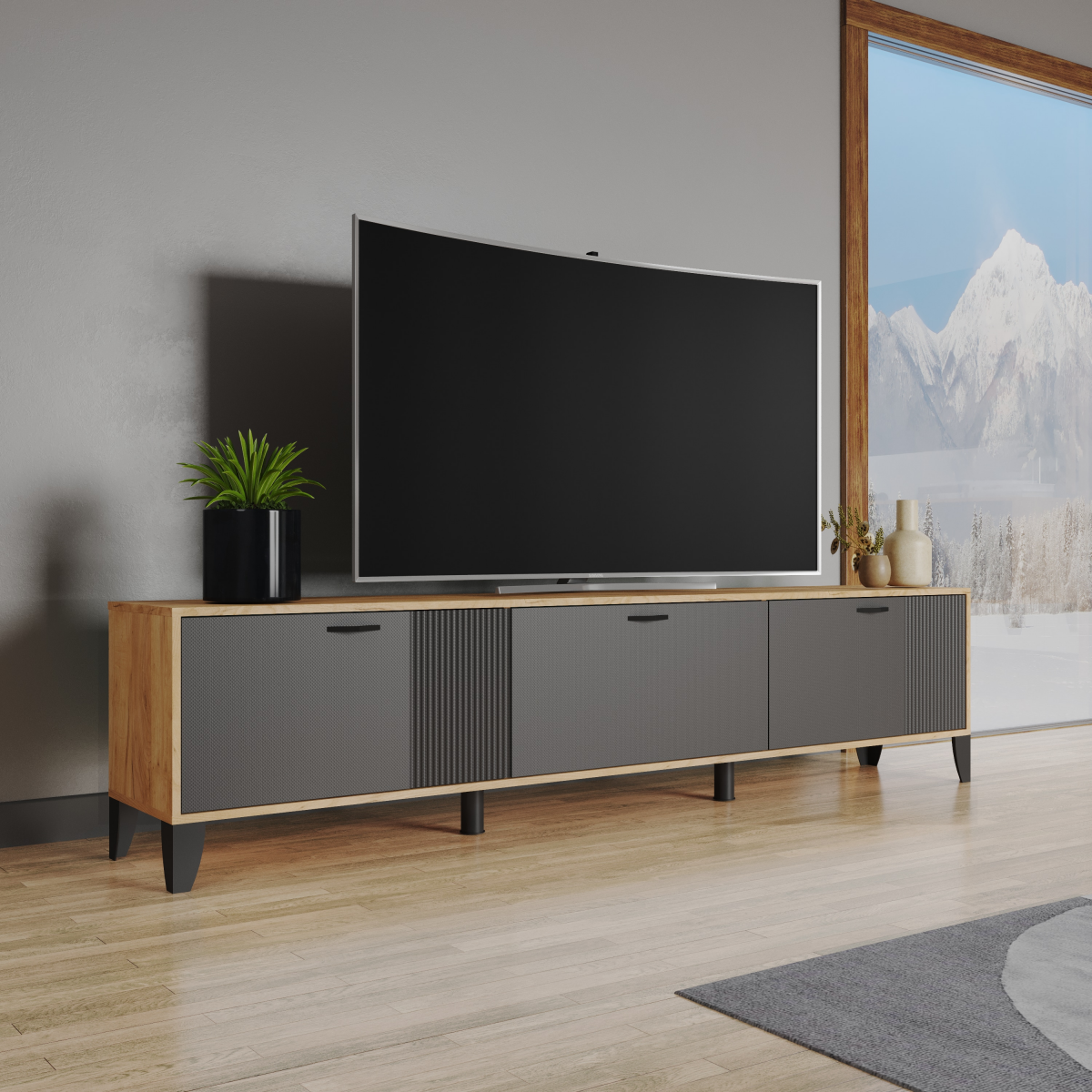 Тумба ТВМ-9 под ТВ выполнена в современных оттенках, корпус - дуб крафт золотой, фасады - карбон вулкан. Тумба позволяет хранить различные аксессуары, кабели, документы внутри ящика и за дверками, что помогает сохранять визуальную чистоту и порядок в гостиной комнате. Тумба выполнена под дерево из качественного ЛДСП. Ручки металлические, черные. Максимальная распределенная нагрузка на верхнюю крышку тумбы - не более 15 кг. К тумба ТВ-9 можно приобрести комплект опор в количестве 6 штук, выполненных в черном цвете и высотой 125 мм. Тумба Рея ТВ прекрасно подходит для установки в гостиной, спальне или детской, обеспечивая надежное и стильное место для размещения телевизора роутера, игровой консоли и сопутствующей техники.