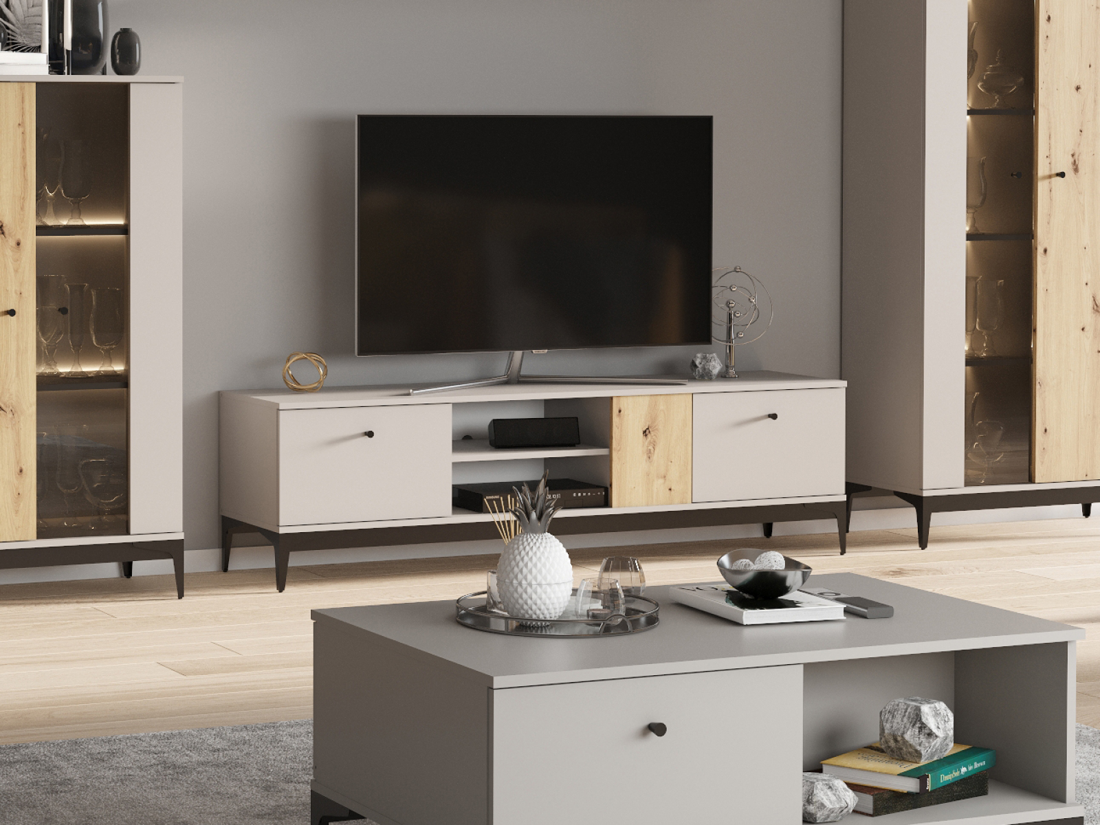 Тумба под ТВ выполнена в скандинавском стиле. Цвет Холодный серый трендовый цвет в сочетании с дубом Артизан подходит для любого современного интерьера гостиной. Тумба Нордик имеет удобные размеры (ВхШхГ): 175х49,6х40 см