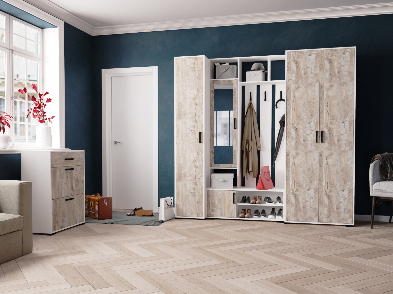 Шкаф платяной 2х створчатый из модульной программы "Бриз" имеет компакные размеры 2100*800*480мм. Наполнение шкафа - две полки и штанга. Прихожая "Бриз" - это стильный и практичный выбор для тех, кто ищет удобное и функциональное решение для своего дома или квартиры. Прихожая выполнена в белом цвете с фасадами в натуральном оттенке дуб юкон, что придает ей элегантный и современный вид. Преимущества прихожей "Бриз"- компактные размеры - прихожая не займет много места в вашей квартире, но при этом обеспечит достаточно места для хранения верхней одежды, обуви и других вещей. Функциональность - прихожая модульная, включает шкаф для одежды, полки для головных уборов и обуви, а также зеркало с тумбой. Качество материалов - прихожая выполнена из высококачественных материалов, которые обеспечивают долговечность и надежность. Стильный дизайн - белый цвет с фасадами дуб юкон придает прихожей элегантный и современный внешний вид, который подойдет для любого интерьера. Шкаф можно установить как отдельно, так и дополнить др.