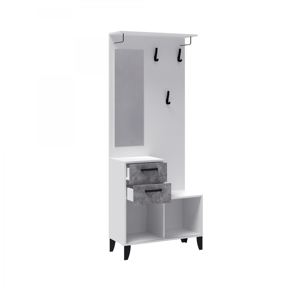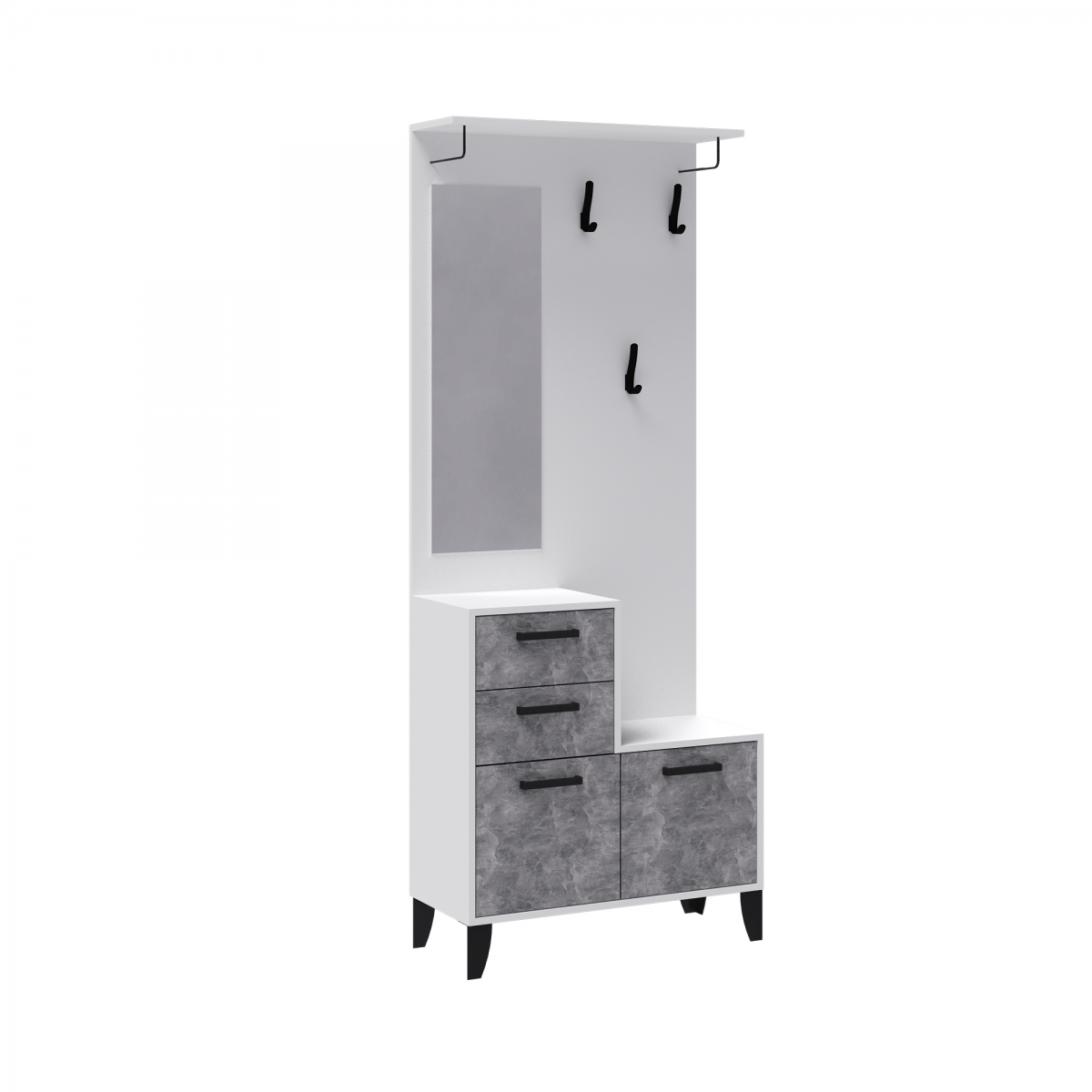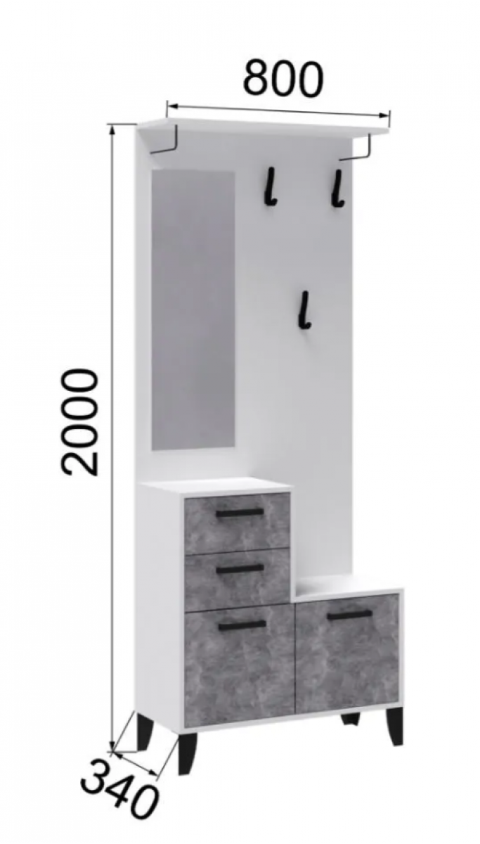 Секция с вешалкой из модульной программы "Витра" имеет вместительную тумбу с выдвижными ящиками и полками. Панель с зеркалом и крючками черного цвета имеет сверху дополнительную полку. Секция может служить самостоятельной прихожей, но также и может быть дополнена 2х дверным шкафом. Секция глубиной 34 см - это находка для малогабаритной прихожей! Прихожая Витра – это идеальное решение для тех, кто ценит комфорт и функциональность в интерьере своего дома. Она выполнена в современном стиле и сочетает в себе элегантность и практичность. Центральная секция в цвете ателье светлый с белым текстурным корпусом создает атмосферу уюта и гармонии в любом помещении. Комплектуется двумя выдвижными ящиками, на роликовых направляющих, в которых удобно хранить перчатки, щетки для обуви. Дополнительно рекомендуется крепить к стене.