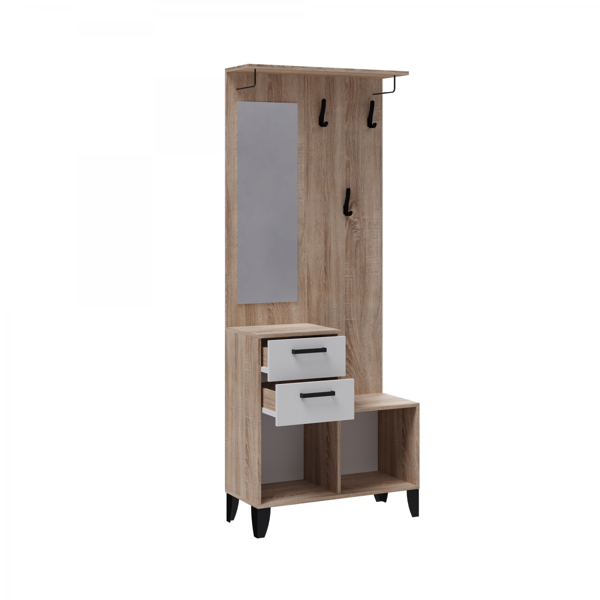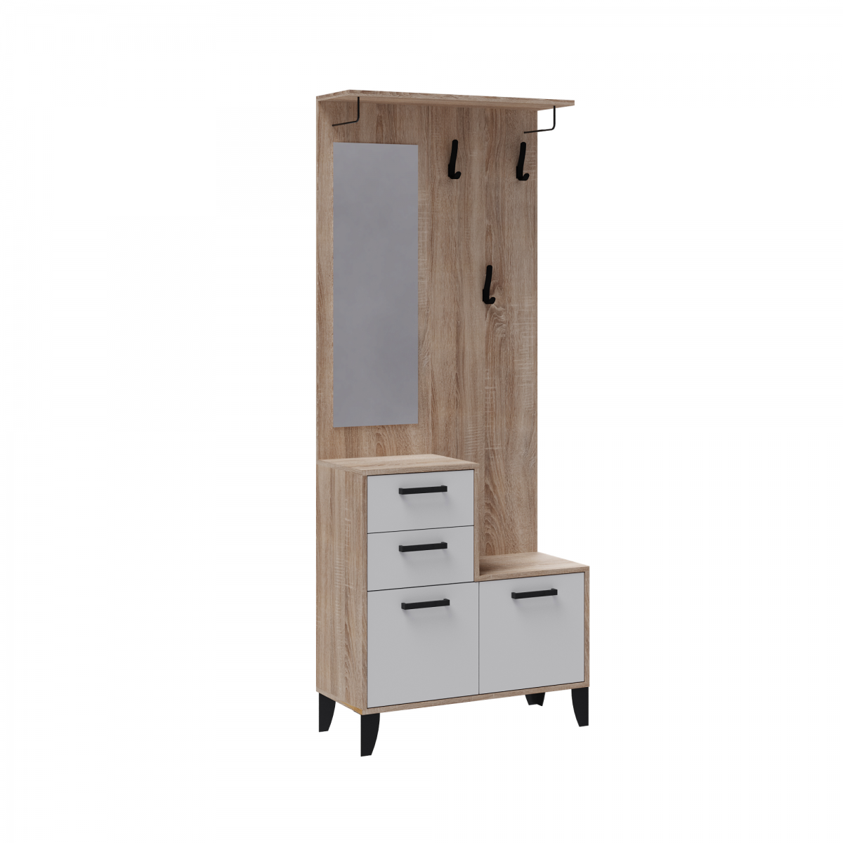 Секция с вешалкой из модульной программы "Витра" имеет вместительную тумбу с выдвижными ящиками и полками. Панель с зеркалом и крючками черного цвета имеет сверху дополнительную полку. Секция может служить самостоятельной прихожей, но также и может быть дополнена 2х дверным шкафом. Секция глубиной 34 см - это находка для малогабаритной прихожей! Прихожая Витра – это идеальное решение для тех, кто ценит комфорт и функциональность в интерьере своего дома. Она выполнена в современном стиле и сочетает в себе элегантность и практичность. Центральная секция в цвете дуб сонома с белым текстурным корпусом создает атмосферу уюта и гармонии в любом помещении. Комплектуется двумя выдвижными ящиками, на роликовых направляющих, в которых удобно хранить перчатки, щетки для обуви. Дополнительно рекомендуется крепить к стене.