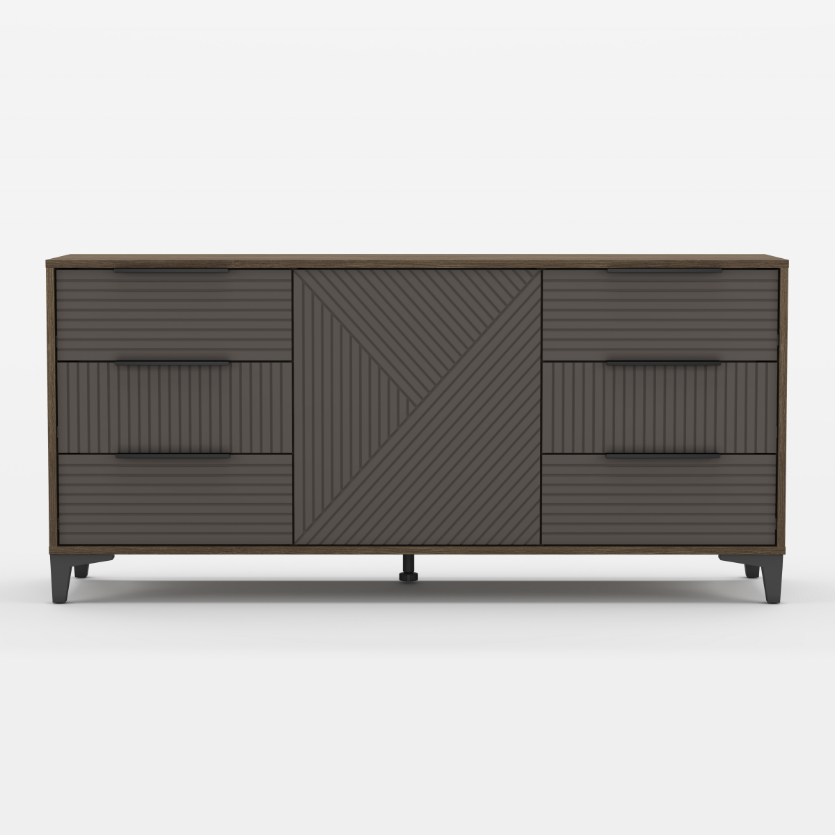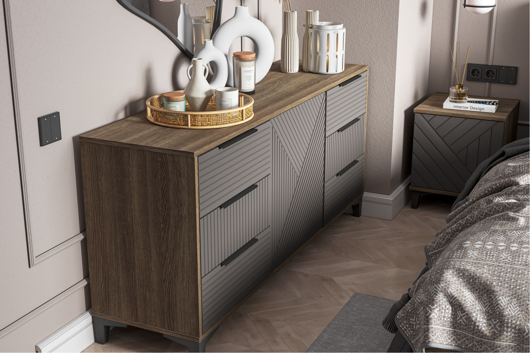 Комод "Палау" с фасадами МДФ с современной фрезеровкой в виде вертикальных и горизонтальных полос. Фасады в пленке "Табак" тактильно напоминают шелковую ткань.