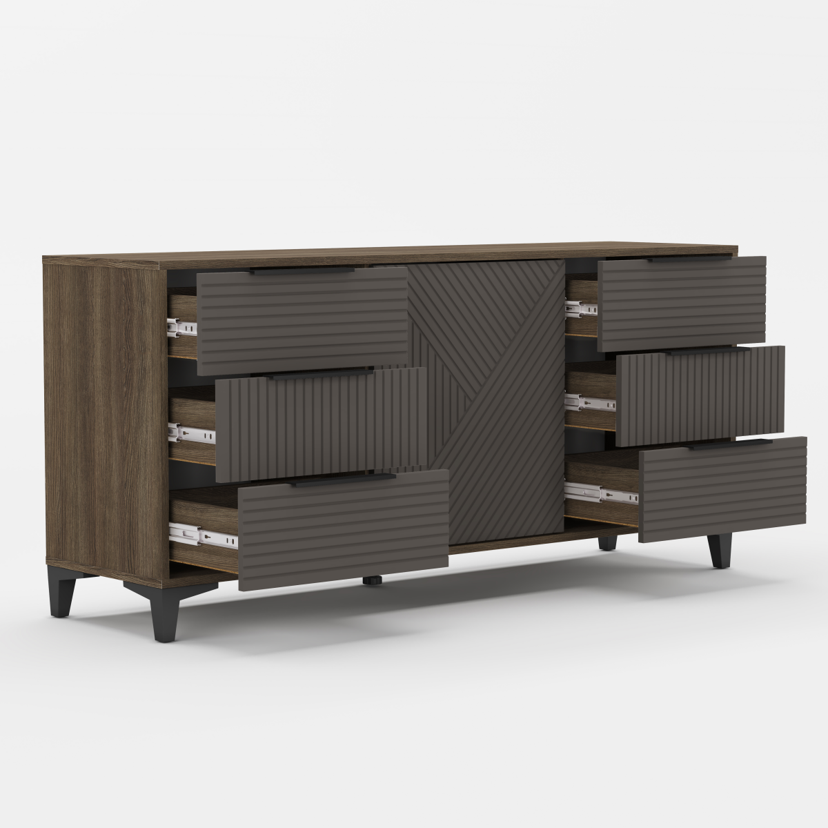 Комод оснащен 6-ю ящикам.Тип направляющих у ящиков – шариковые. Такой тип направляющих обеспечивает плавное открывание и закрывание ящиков. Так же комод имеет одну дверцу, открывающуюся в стороны. Такой механизм позволяет легко получать доступ к содержимому.