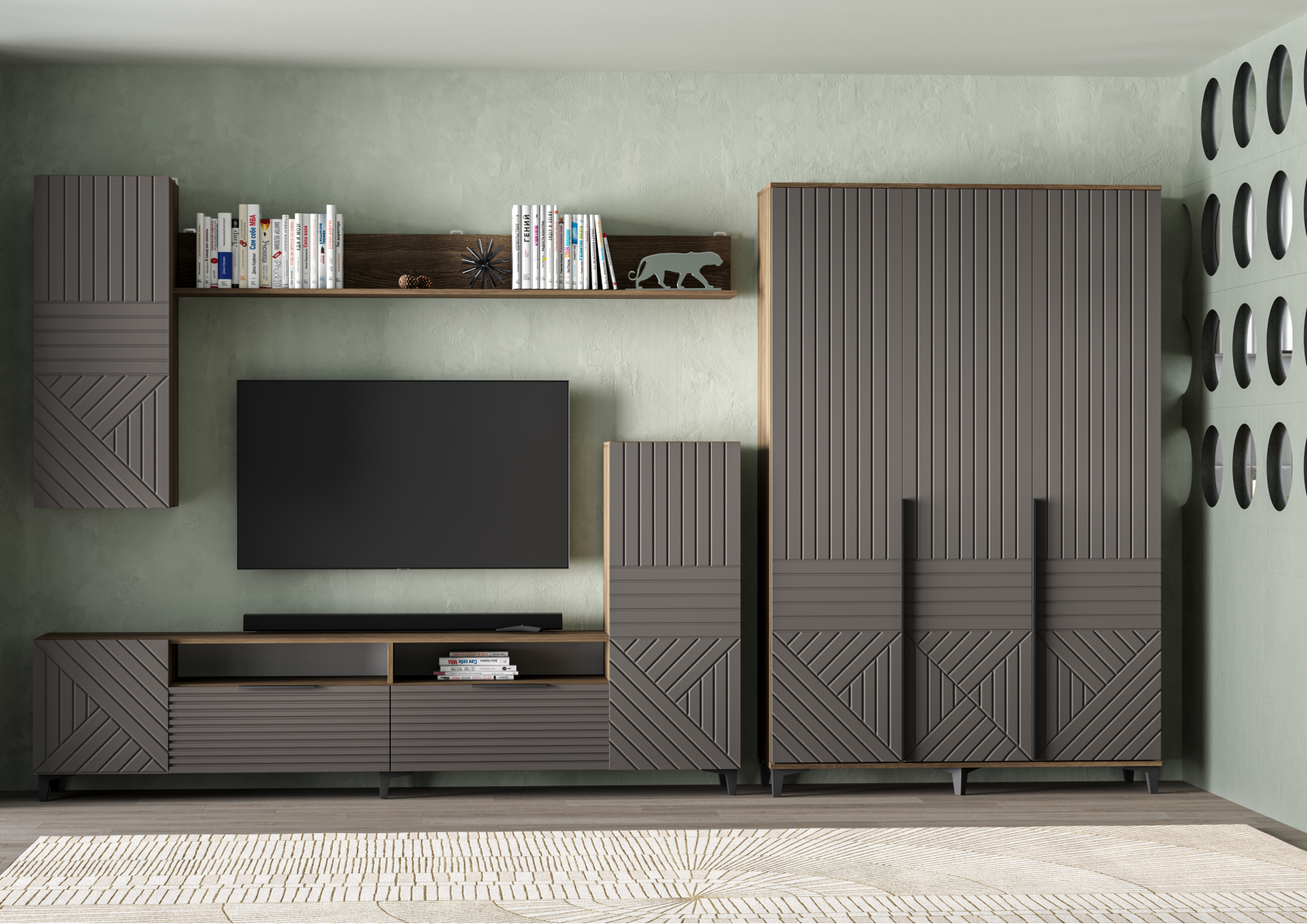 Шкаф "Палау" — это стильный и функциональный элемент мебели, который привлекает внимание своим современным дизайном и продуманной эргономикой. Основной особенностью шкафа Палау является его способность органично сочетать форму и функцию. Сочетание корпуса цвета «табак» и фасада «грей софт» создает элегантный контраст, придавая шкафу современный вид.